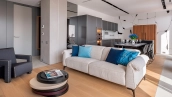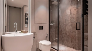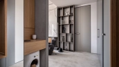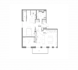 Спланирована кухня-гостиная-столовая с выходом на балкон, мастер-спальня с собственной ванной комнатой, огороженной стеклянной перегородкой, и гардеробной, кабинет, который можно оборудовать под спальню, санузел с душевой и постирочной зоной, собственный хамам, прихожая. Окна выходят в тихий двор.