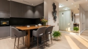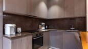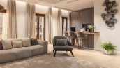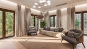 Планировка: кухня-гостиная, 2 спальни, гардеробная, ванная комната, гостевой санузел, прихожая. Панорамное остекление наполняет пространство светом, открываются виды на две стороны света. Кухня оснащена немецкой техникой Bosch, гардеробная со стиральной и сушильной машинами Miele, электрокамин в гостиной от Glenrich, аудиосистема немецкого бренда Canton. Центральная система очистка воды.