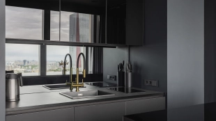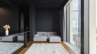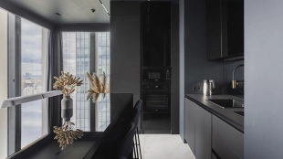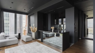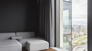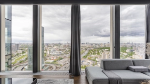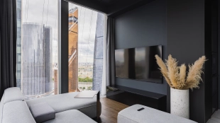 Функциональная планировка включает просторную кухню-гостиную с обеденной зоной, спальню, ванную комнату с окном и холл. Благодаря панорамному остеклению пространство наполнено естественным светом и теплом, открываются виды на город, башни «Москва-Сити» и территорию комплекса.