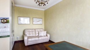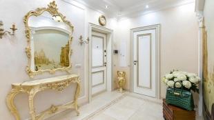 Видовая квартира площадью 180 м² в доме на северо-западе Москвы рядом с парком Покровское-Стрешнево. Выполнен дизайнерский ремонт, интерьер оформлен в классическом итальянском стиле. На полу уложен паркет из натурального дерева нескольких сортов — тик, дуб, мербау. Стены прихожей украшены росписью с венецианским пейзажем.