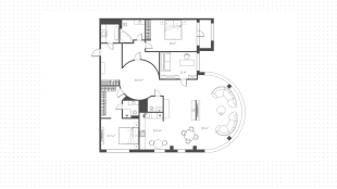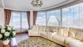 Спланирована просторная кухня-гостиная 75 м² с эффектным панорамным эркером, из окон которого открывается панорамный вид на парк на уровне крон деревьев. Две мастер-спальни со своими санузлами, кабинет, гостевой санузел, постирочная. Квартира укомплектована мебелью, кухня премиум-класса. Установлены кондиционеры, тёплые полы, сантехника.