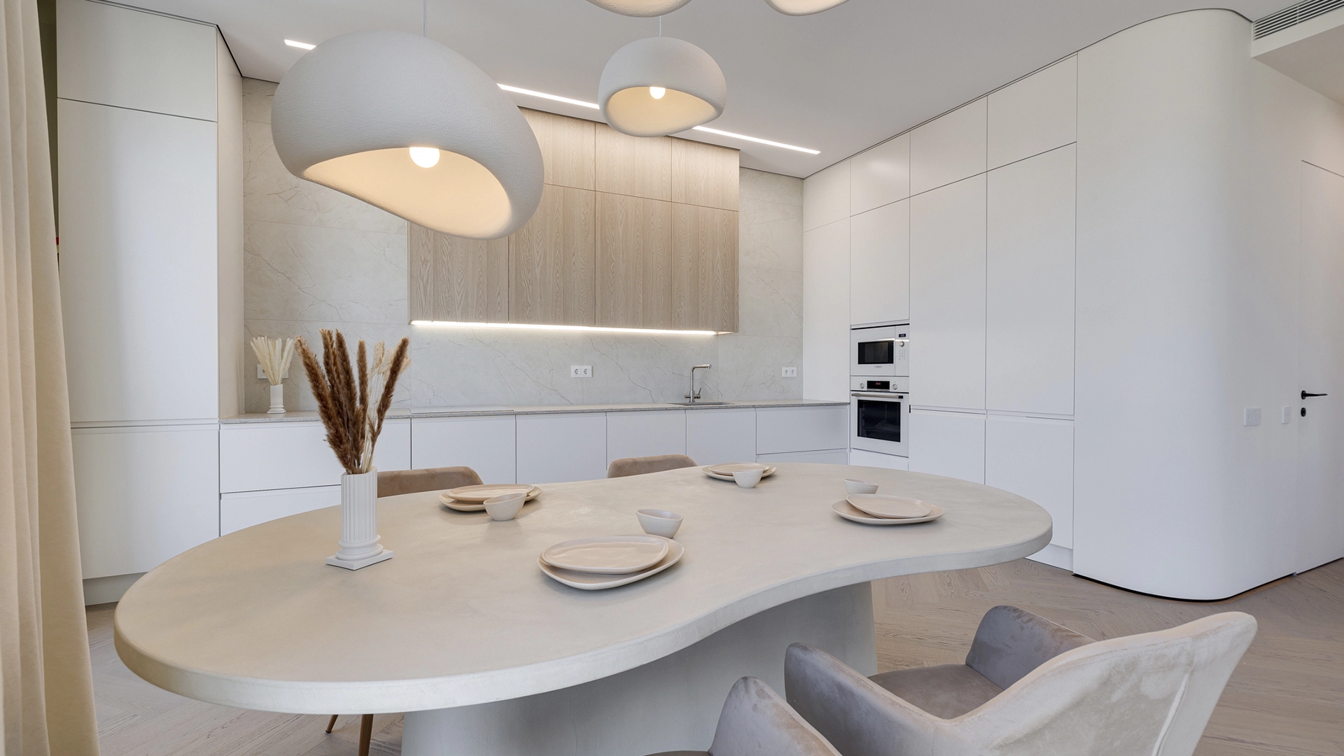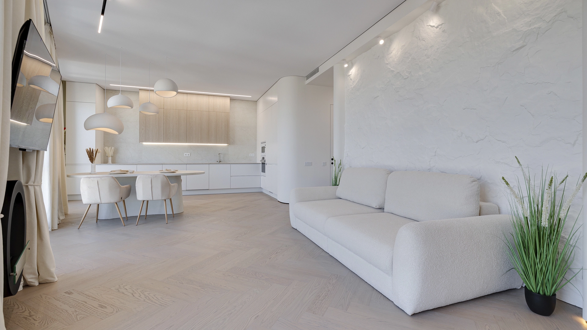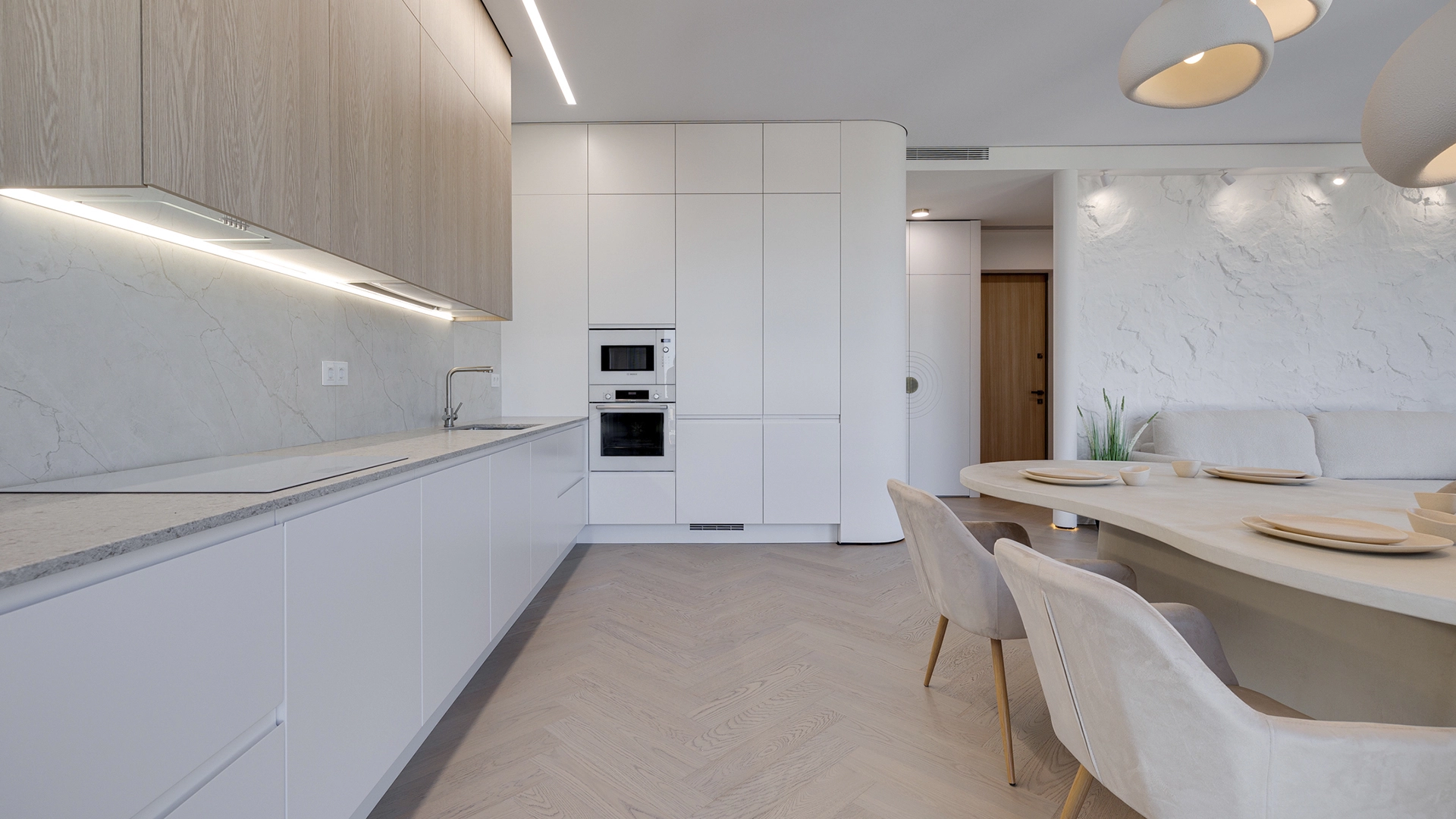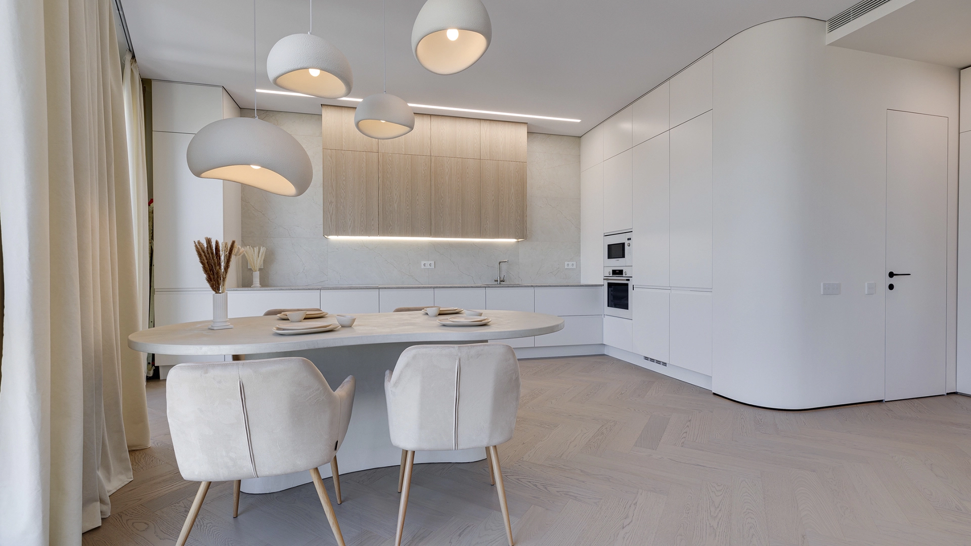 Электрокарнизы, различные сценарии освещения управляются голосом и с телефона. Квартира укомплектована мебелью и бытовой техникой. Функциональная планировка включает кухню-гостиную с обеденной зоной, мастер-спальню со своей ванной комнатой, вторую спальню с гардеробной, гостевой санузел. Благодаря панорамному остеклению пространство наполнено естественным светом и теплом, открываются виды на город.