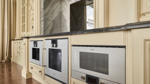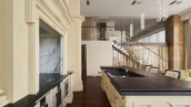 Первый уровень, площадь 192 м². Спланирована просторная угловая кухня-гостиная с потолком высотой 4,9 метра. Встроенная кухня от известного английского премиального бренда Clive Christian с островом оснащена премиальной техникой Gaggenau. Гостиная представлена обеденной зоной на 6 персон и мягкой группой для проведения ярких вечеров в компании семьи и друзей.