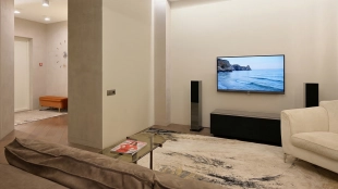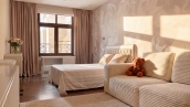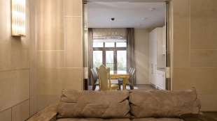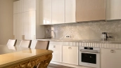 Квартира с тремя спальнями общей площадью 134 м² в комплексе Grand Deluxe на Плющихе на втором этаже. Выполнена дизайнерская отделка в современном стиле в светлых лаконичных тонах. Проектом предусмотрено функциональное зонирование кухни и гостиной с помощью стеклянной перегородки. Квартира укомплектована мебелью и бытовой техникой. Планировка включает гостиную, кухню, три спальни, два санузла, две гардеробные, лоджию и прихожую. Окна ориентированы на две стороны света, открываются виды на благоустроенную территорию комплекса.