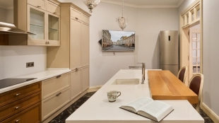 Просторная квартира с тремя спальнями общей площадью 204 м² в комплексе делюкс-класса «Дом на Смоленской» на третьем этаже. Выполнена дизайнерская отделка в стиле современной классики. Интерьеры украшены декоративными молдингами и карнизами. Квартира укомплектована мебелью и бытовой техникой. Установлена система центрального кондиционирования.