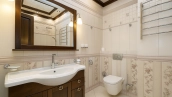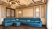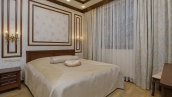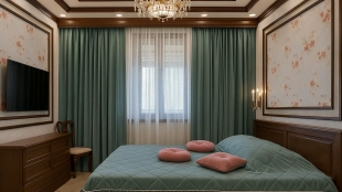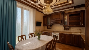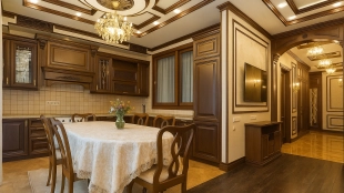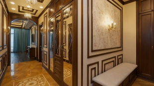 Апартаменты с двумя спальнями общей площадью 92 м² в комплексе Smolensky De Luxe. Выполнен дизайнерский ремонт в классическом стиле. Интерьер выдержан в цветах благородного дерева с мягкими акцентами бирюзы. В отделке использована натуральная древесина и камень. Полы выложены мрамором и тёмным паркетом. Кессонные потолки с резными узорами и золотистыми подвесными люстрами с декором из стекла.