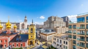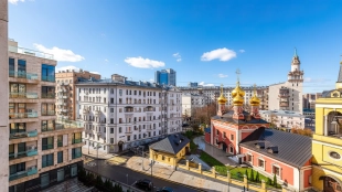 Планировка: кухня-гостиная, две спальни со своими ванными комнатами и встроенными гардеробными шкафами, гостевой санузел, балкон и холл. Установлена мягкая мебель, в гостиной большой угловой диван, обеденный стол на четыре персоны. Кухня оборудована встроенной бытовой техникой. С балкона открывается вид на Никольскую церковь в сторону Садового кольца и Нового Арбата.