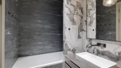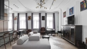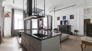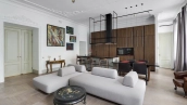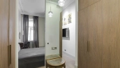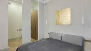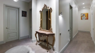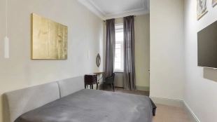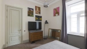 Квартира с четырьмя спальнями общей площадью 170 м² в доме «Остоженка, 7» на втором этаже. Выполнена дизайнерская отделка в неоклассическом стиле в светлых тонах. Стены и потолки украшены декоративными молдингами, карнизами и лепными деталями. Продуманы различные сценарии освещения — люстры, настенные светильники и споты. Установлена приточно-вытяжная система вентиляции.