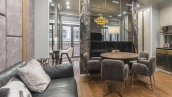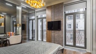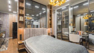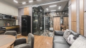Студия площадью 53 м² в комплексе делюкс-класса «Софийский». Выполнена дизайнерская отделка с использованием премиальных материалов. Апартаменты укомплектованы мебелью и бытовой техникой. Стены отделаны натуральным деревом орехом, полы из дуба. Новый ремонт, фото соответствуют реальному состоянию апартаментов. Спланирована зона кухни-гостиной и спальни, санузел, гардеробная, прихожая. Большой балкон вдоль всей стены. Благодаря панорамным окнам пространство наполнено теплом и светом.