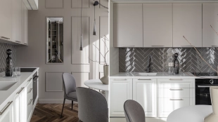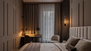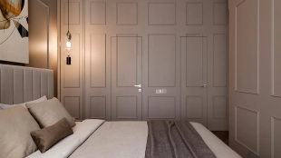 Апартаменты с двумя спальнями общей площадью 62 м² в комплексе особняков Titul на Серебрянической. Апартаменты расположены на пятом этаже в корпусе Aureus. Выполнена отделка по индивидуальному дизайн-проекту, интерьеры украшают декоративные молдинги. Высота потолков 3,15 метра. Установлена индивидуальная система кондиционирования.