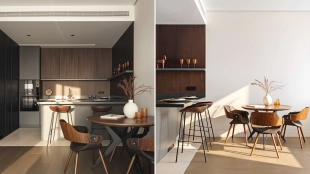 Уютные апартаменты с 2 спальнями в комплексе премиум-класса «Поклонная, 9», на 21 этаже, откуда открываются захватывающие виды на Парк Победы. Интерьер оформлен в современном стиле, автор дизайна — Галина Данилова. Проект опубликован в журнале SALON-interior. Тёплые природные оттенки камня и американского ореха и дуба создают уютную атмосферу, а тёмные и золотистые металлические акценты добавляют изюминки.