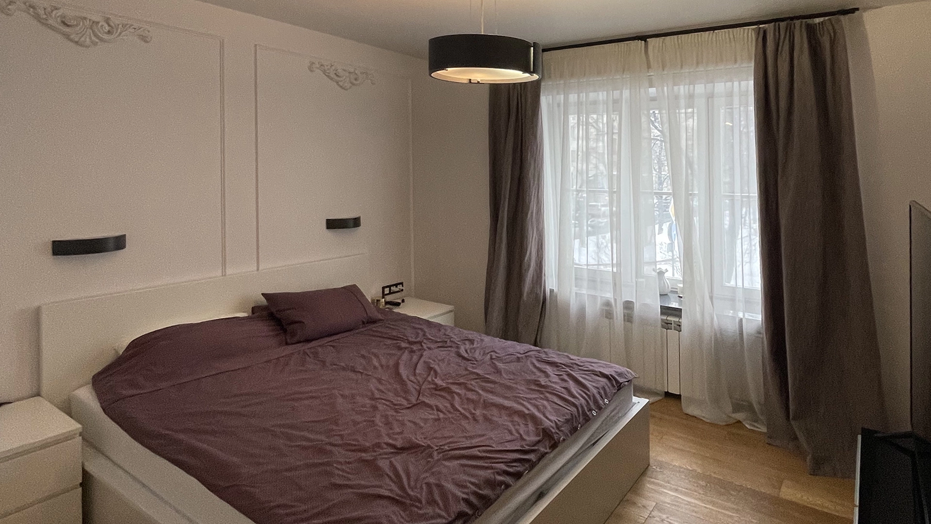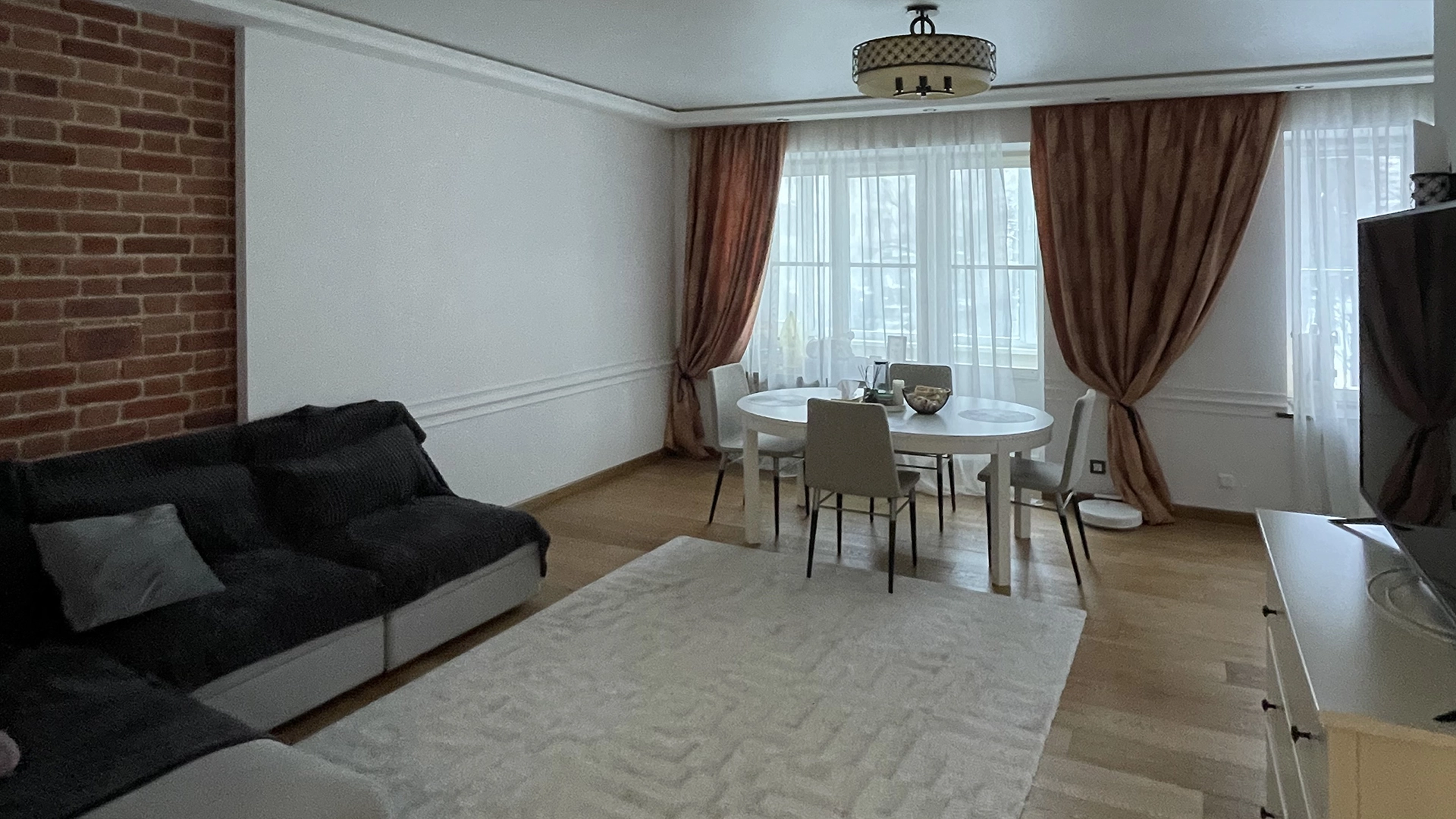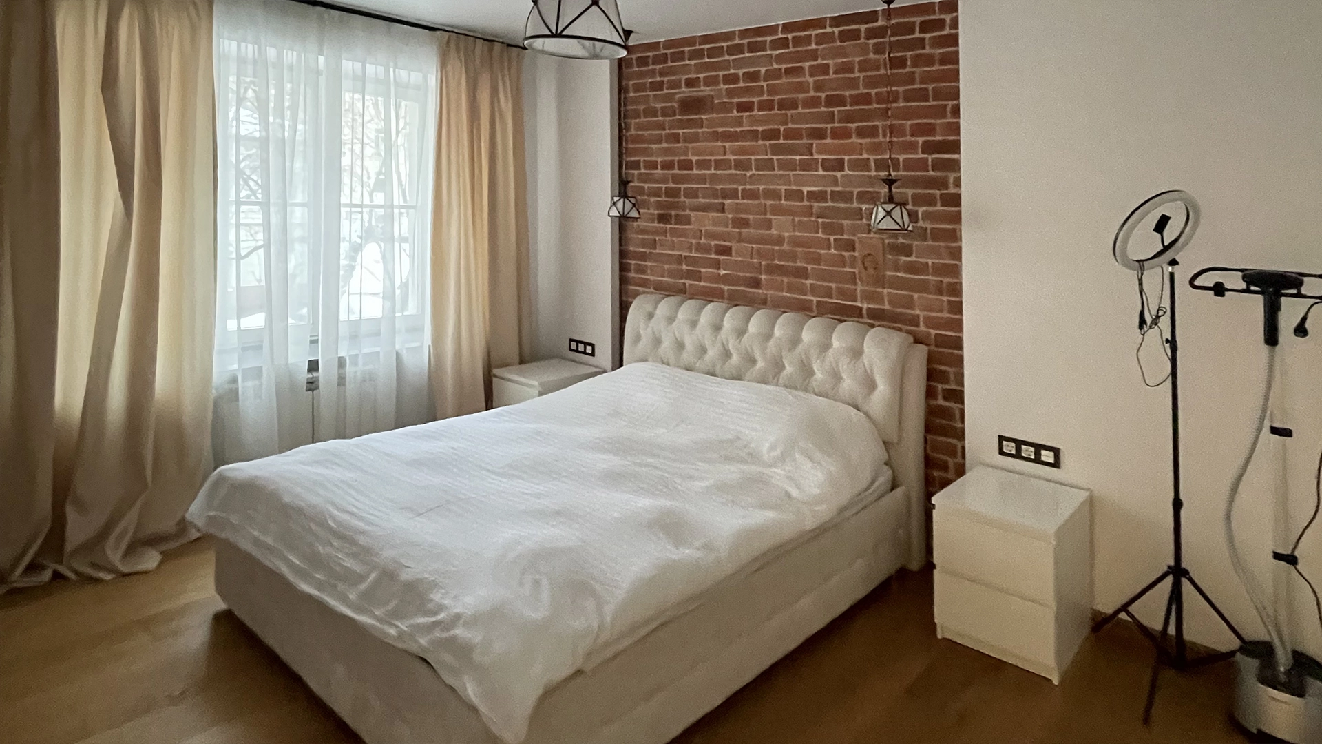 Просторная квартира с четырьмя спальнями общей площадью 145 м² в доме напротив Патриаршего пруда. Квартира с отделкой расположена на втором этаже. Интерьер — в современном стиле в светлых тонах, часть стен оформлена открытой кирпичной кладкой. Спланирована гостиная с выходом на балкон, кухня, четыре спальни, одна из которых с балконом, две ванные комнаты, гостевой санузел, холл. Квартира полностью меблирована и оборудована бытовой техникой. Окна ориентированы на три стороны, открываются виды на пруд и в тихий уютный двор.
