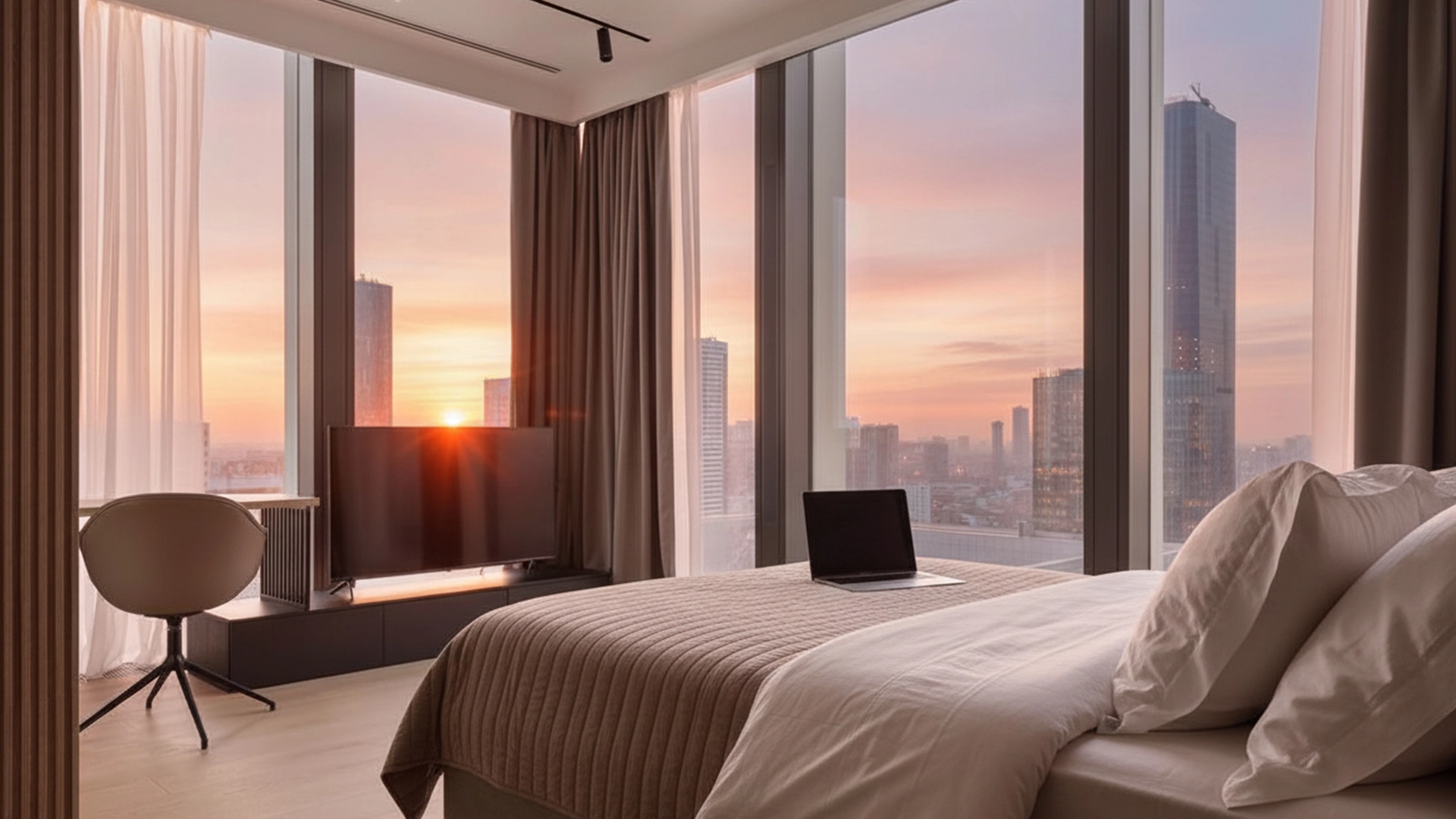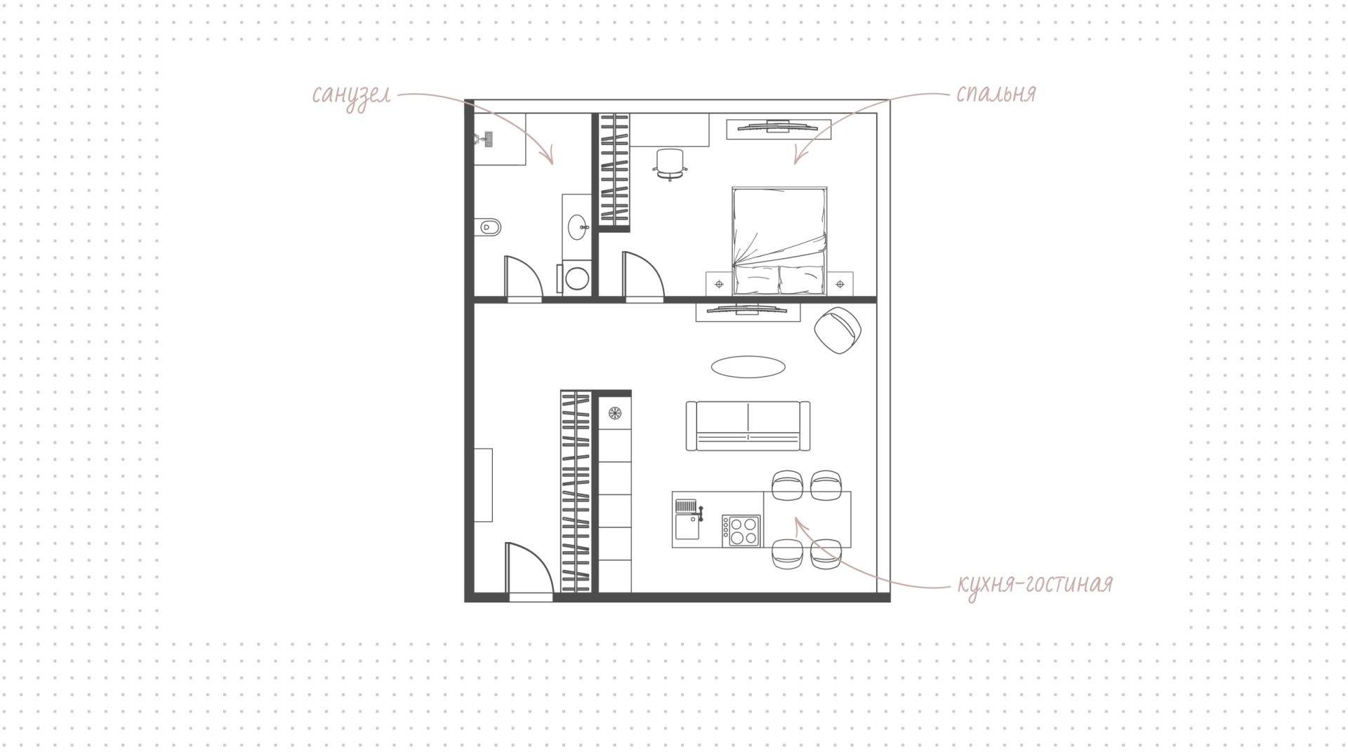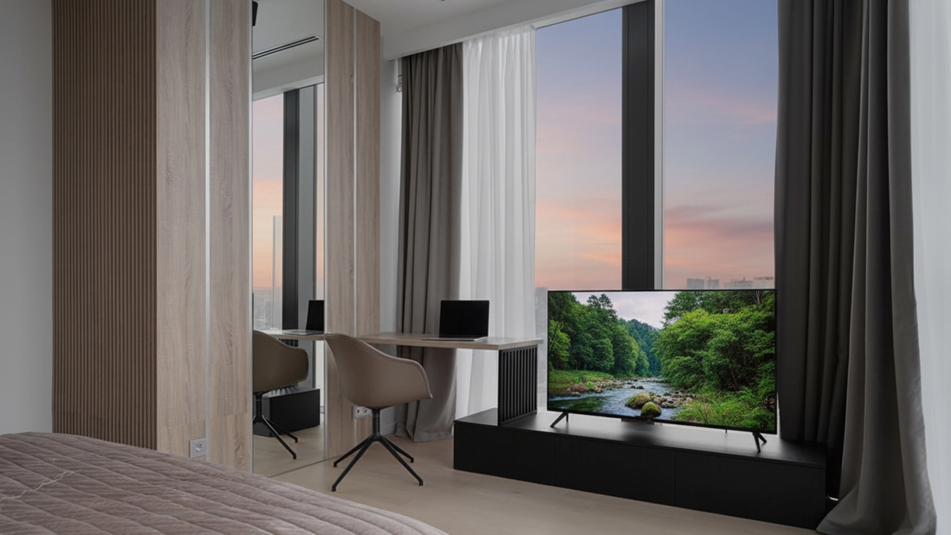 Функциональная планировка включает кухню-гостиную, спальню, санузел и прихожую. Апартаменты полностью меблированы и укомплектованы бытовой техникой. Панорамные окна, ориентированные юго-запад, открывают виды на город, а по вечерам позволяют любоваться закатами.