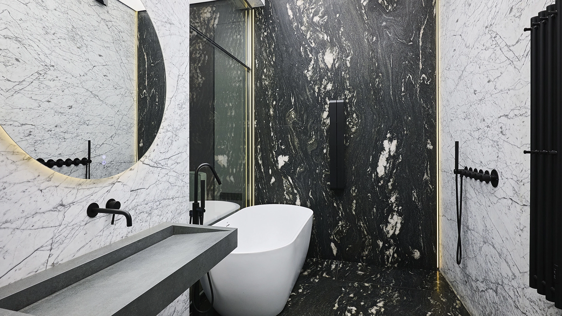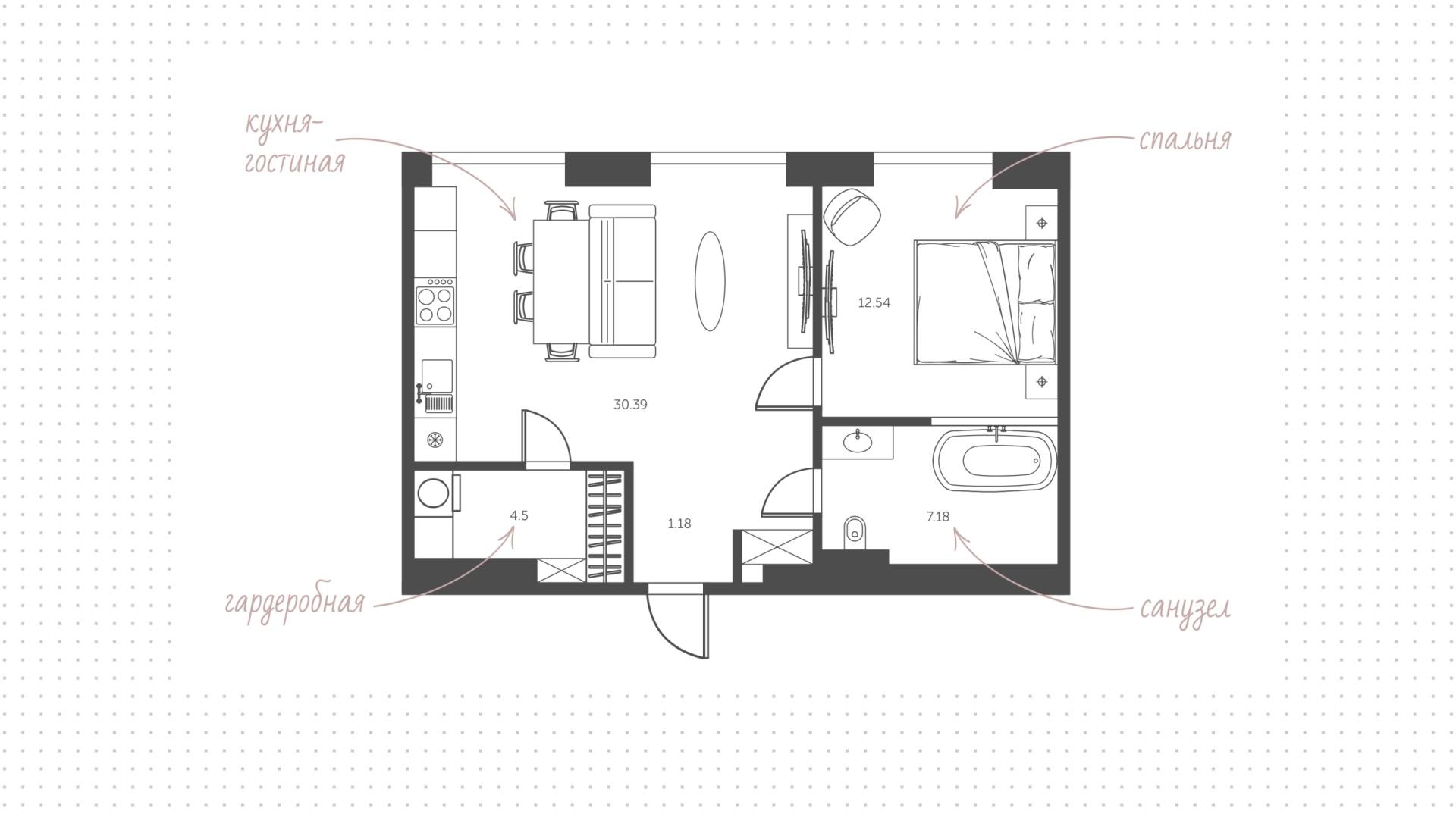 Квартира меблирована и укомплектована бытовой техникой. Функциональная планировка включает кухню-гостиную с обеденной и ТВ зонами, спальню, ванную комнату, гардеробную с постирочной зоной и прихожую. Из панорамным окон открываются виды на башни «Москва-Сити» и Москву-реку.