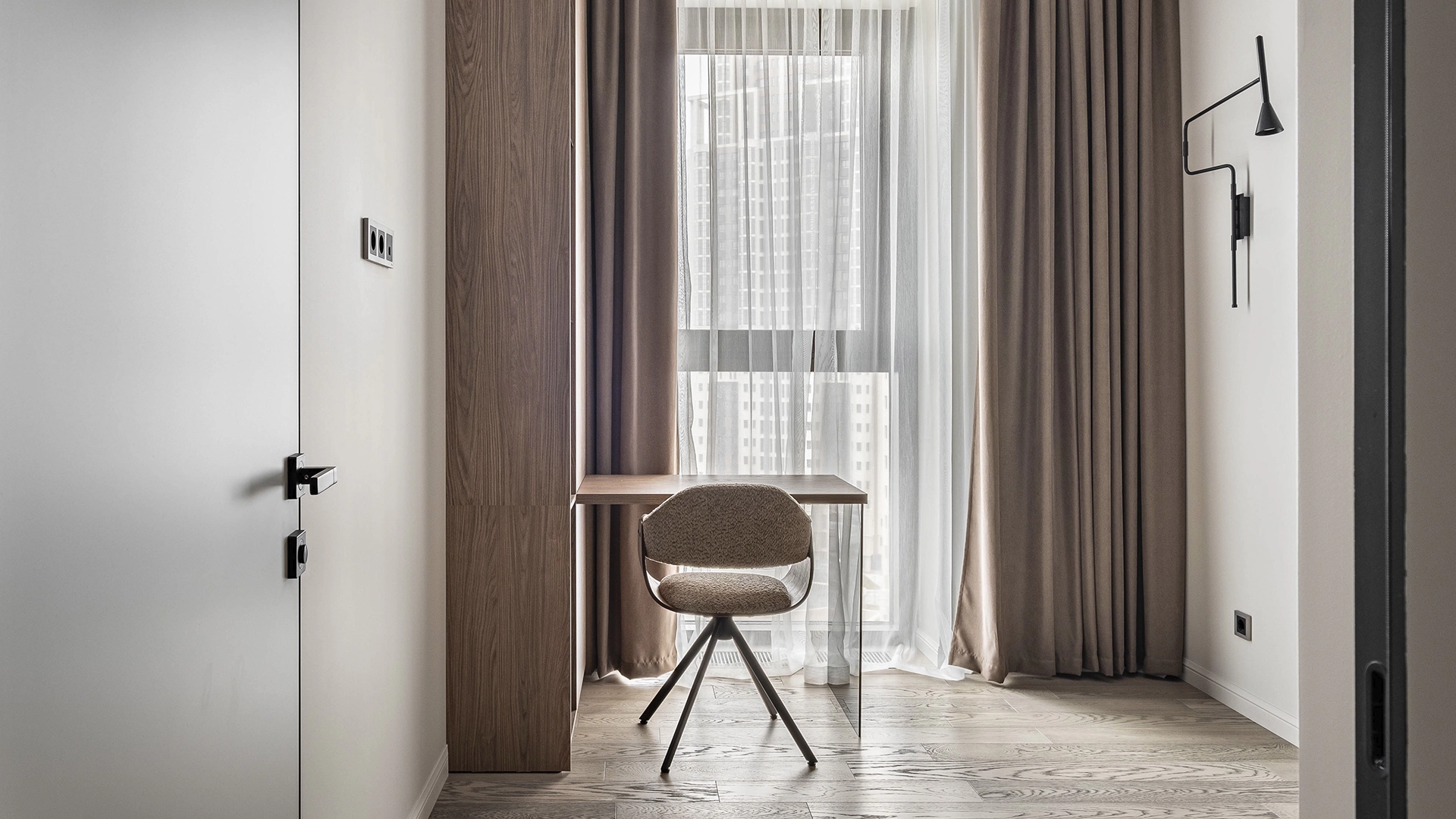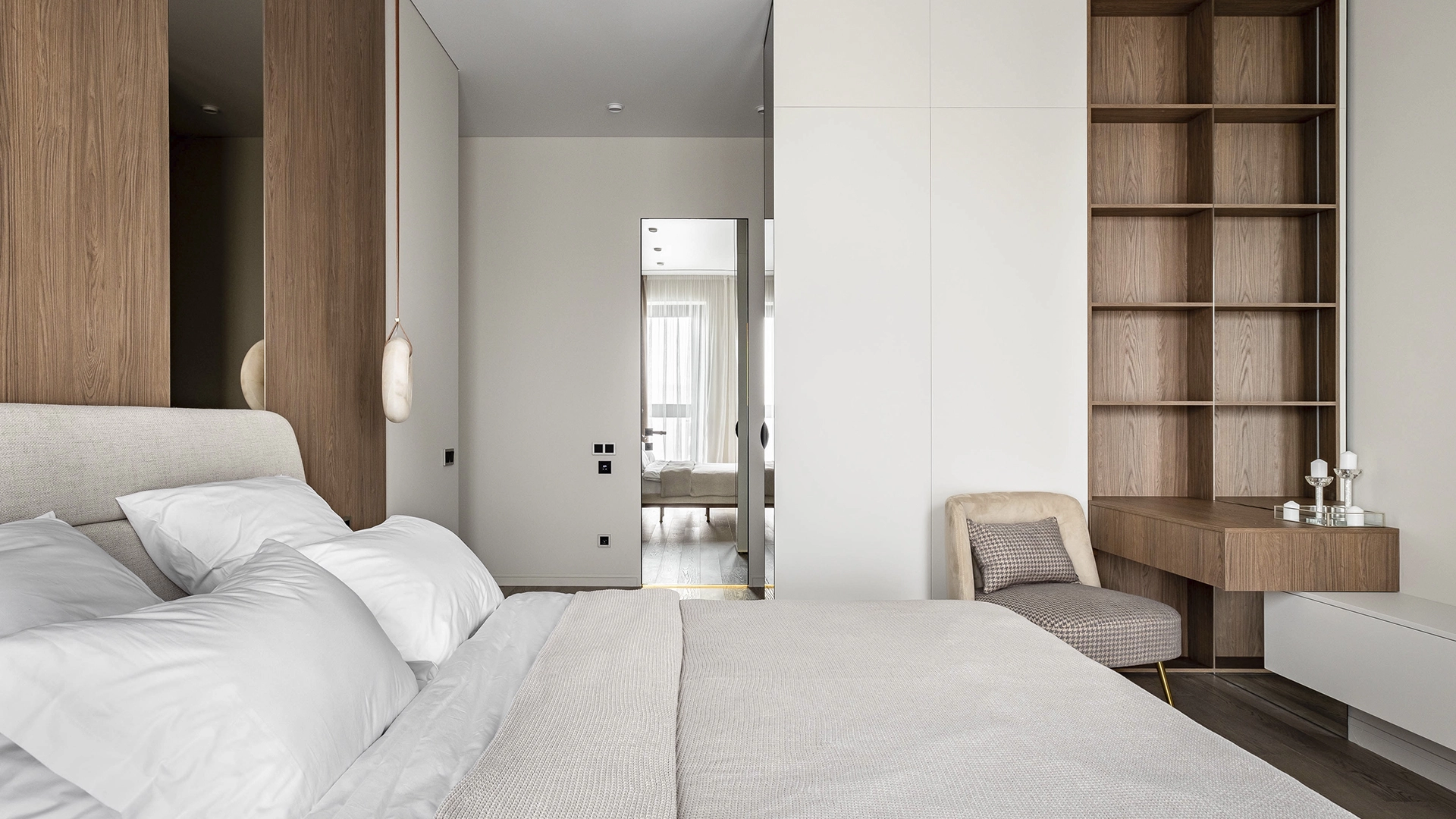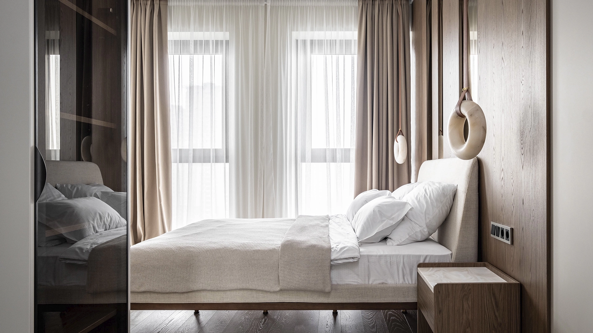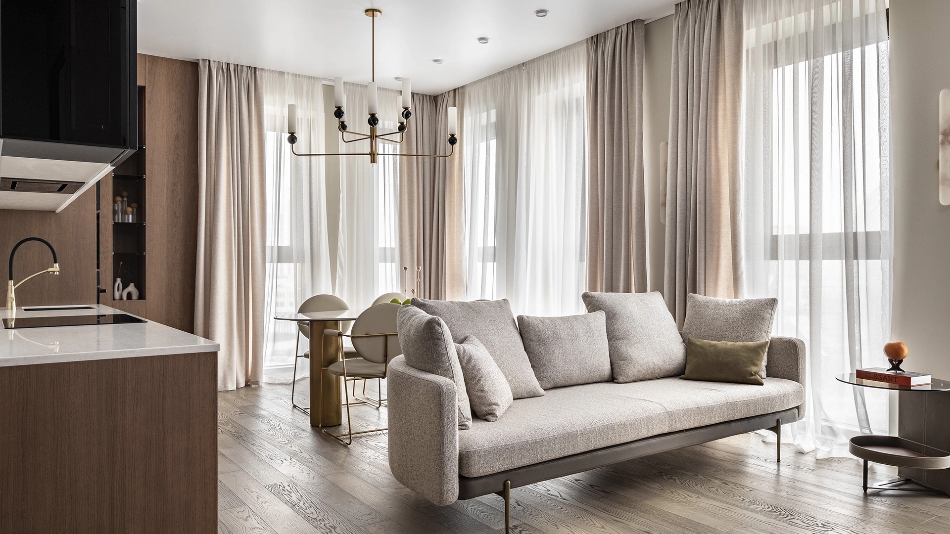 Угловая квартира с 3 спальнями общей площадью 104 м² в клубном доме бизнес-класса Full House. Квартира с дизайнерской отделкой расположена на 12 этаже в корпусе 1. В оформлении использованы натуральные материалы — дубовый шпон, инженерная доска. Квартира полностью меблирована и укомплектована техникой Gorenje.
