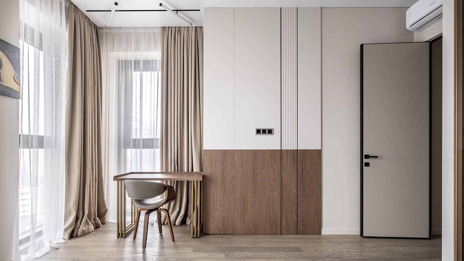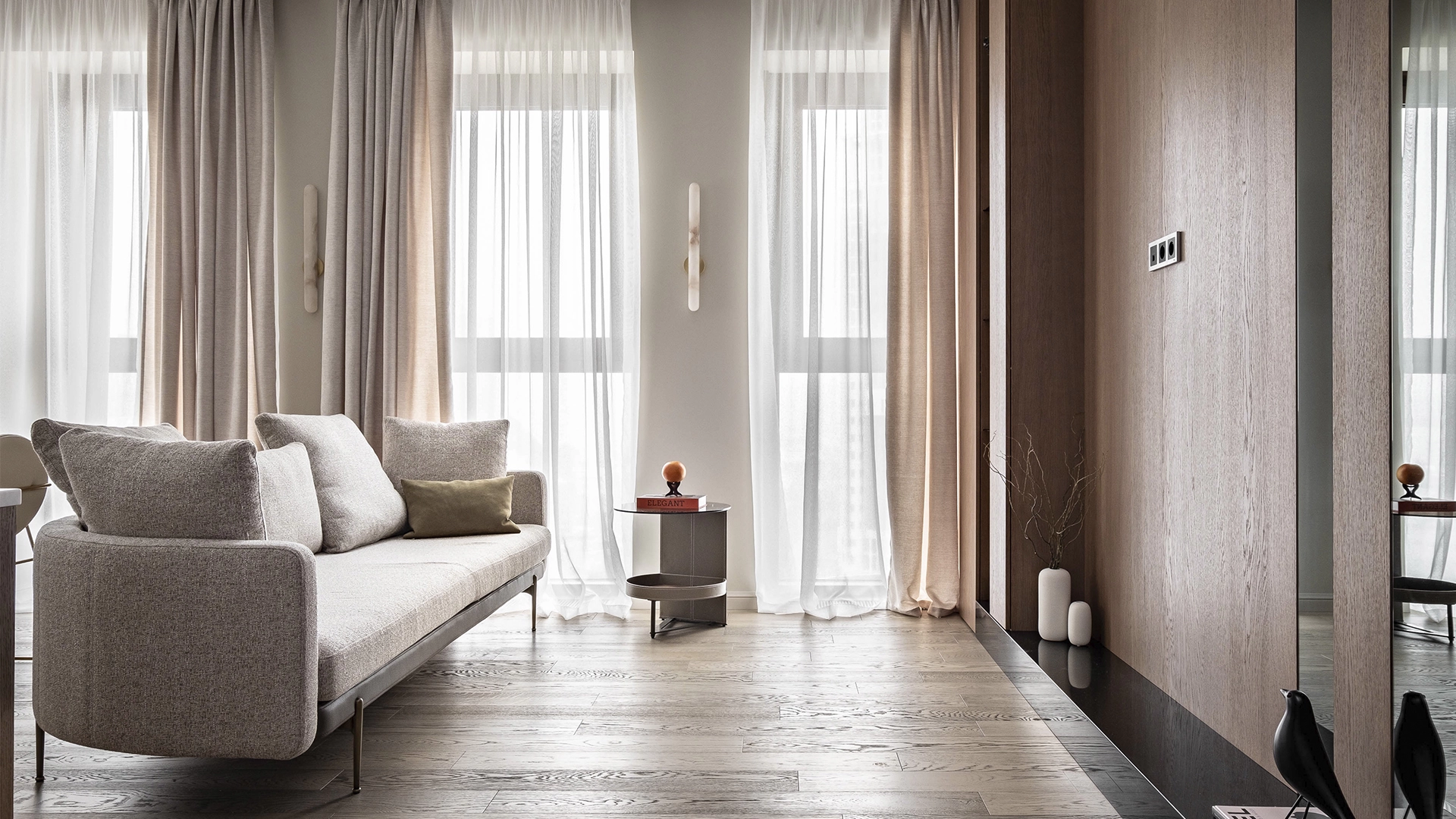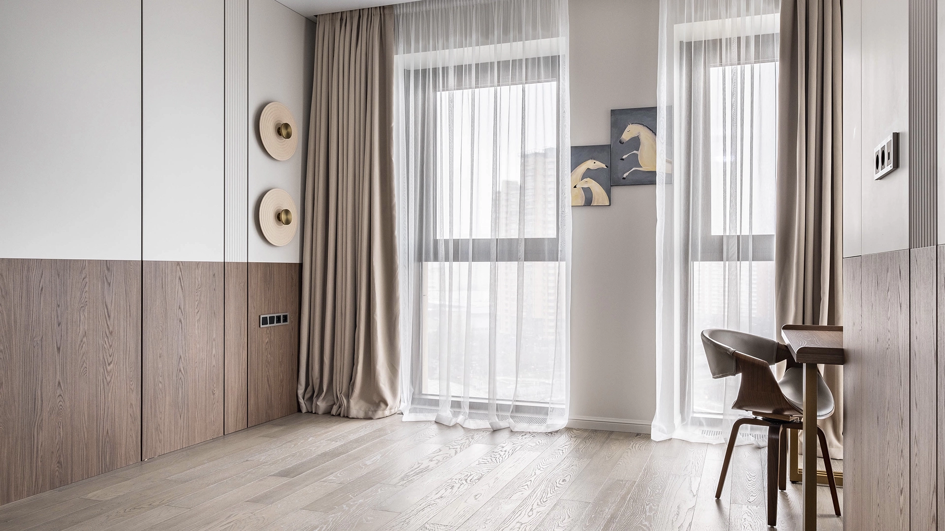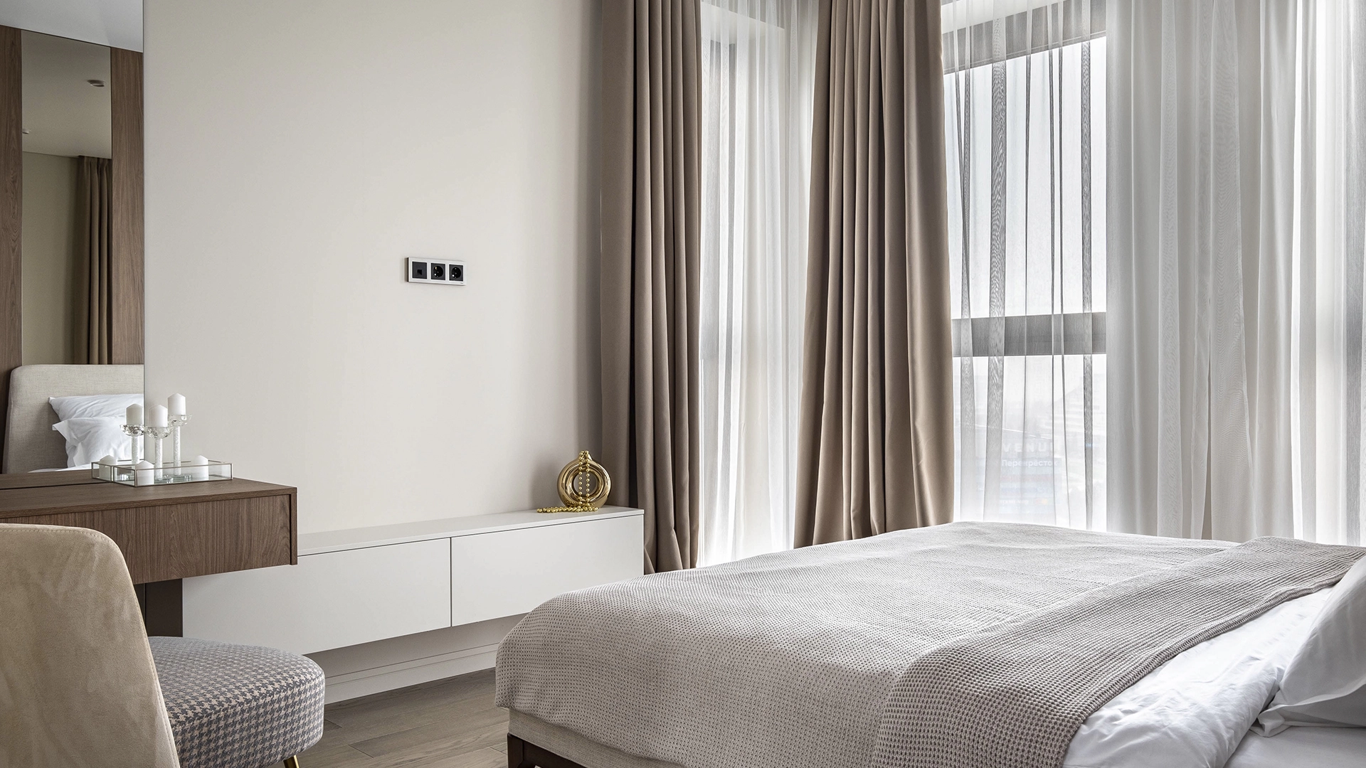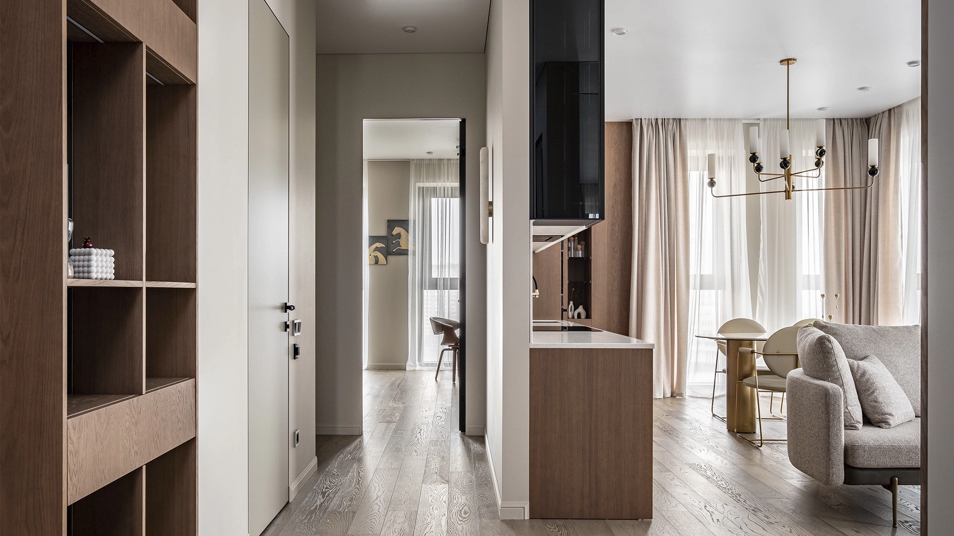 Угловая квартира с 3 спальнями общей площадью 104 м² в клубном доме бизнес-класса Full House. Квартира с дизайнерской отделкой расположена на 12 этаже в корпусе 1. В оформлении использованы натуральные материалы — дубовый шпон, инженерная доска. Квартира полностью меблирована и укомплектована техникой Gorenje.