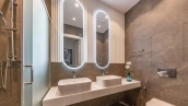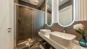 Спланирована кухня-гостиная с обеденной зоной и выходом на лоджию, мастер-спальня с гардеробной, вторая спальня, ванная комната, санузел с душевой, постирочная, прихожая. Апартаменты меблированы и оборудованы бытовой техникой от ведущих мировых производителей. Установлены подогрев полов в санузлах и коридоре, кондиционеры в каждой комнате, приточно-вытяжная вентиляция. Из окон открывается вид в благоустроенный двор.
