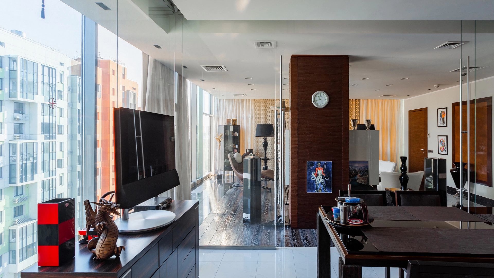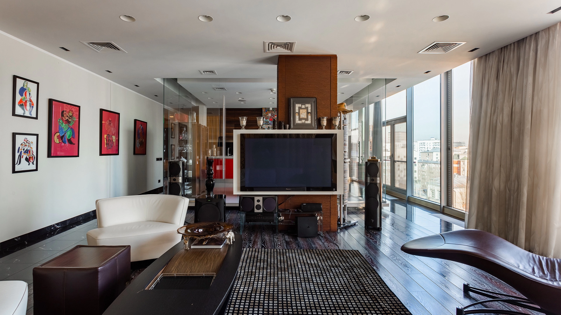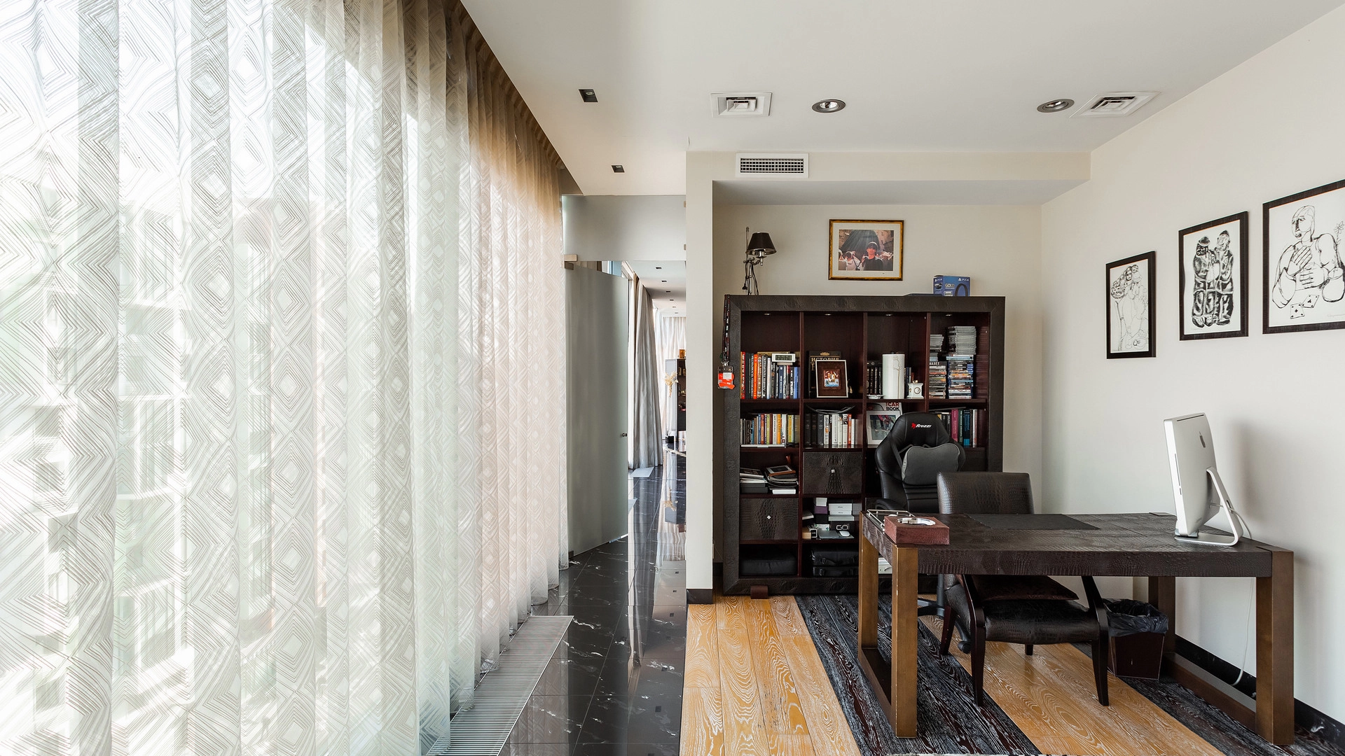Квартира с двумя спальнями площадью 178 м² в клубном доме «Панорама» на седьмом этаже. Интерьер оформлен в эклектичном стиле по авторскому дизайн-проекту. В отделке использованы натуральные материалы. Благодаря панорамному остеклению и высоким потолкам пространство наполнено светом. Из окон открывается вид на столичные крыши и Собор Непорочного Зачатия Пресвятой Девы Марии.