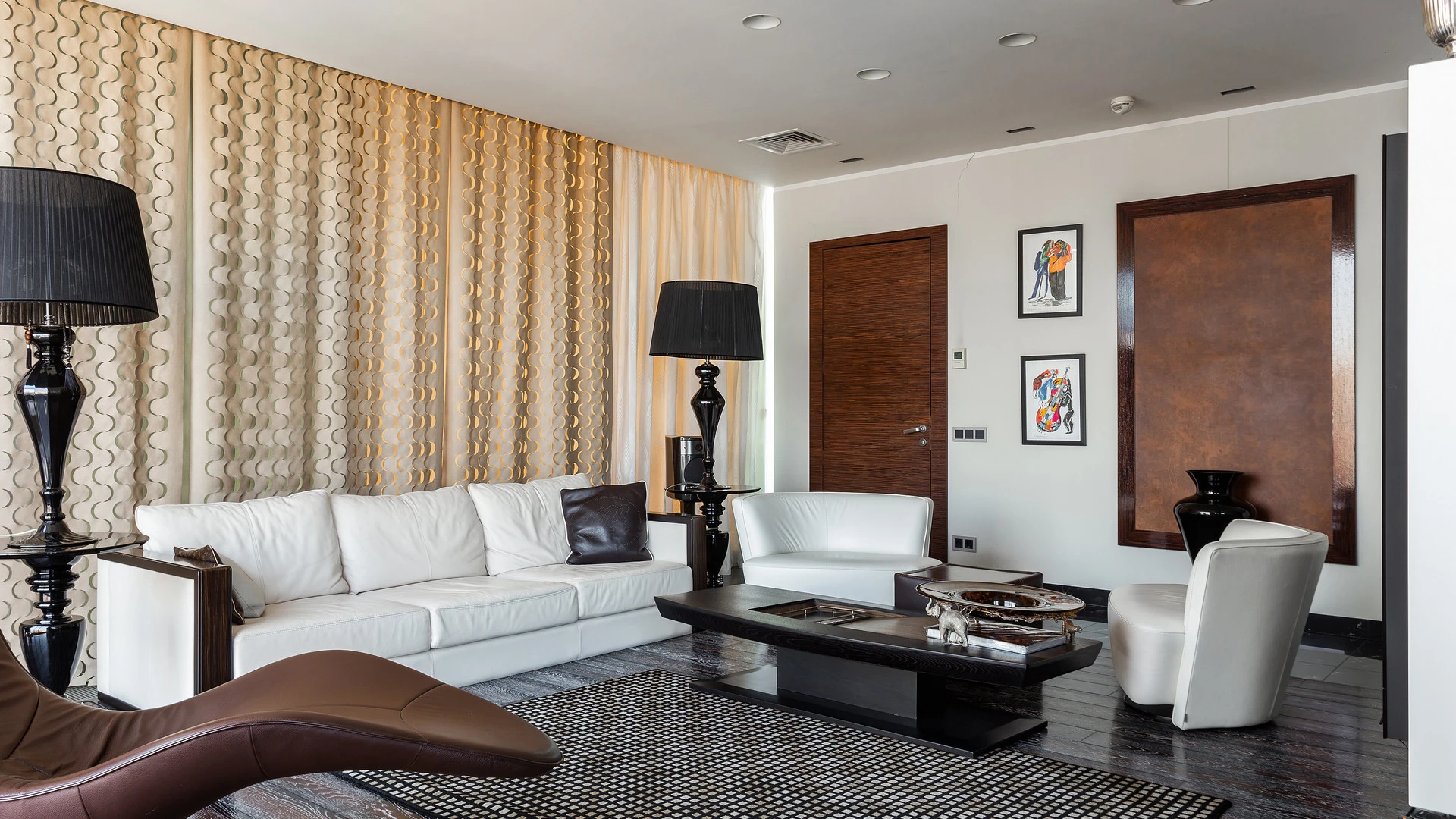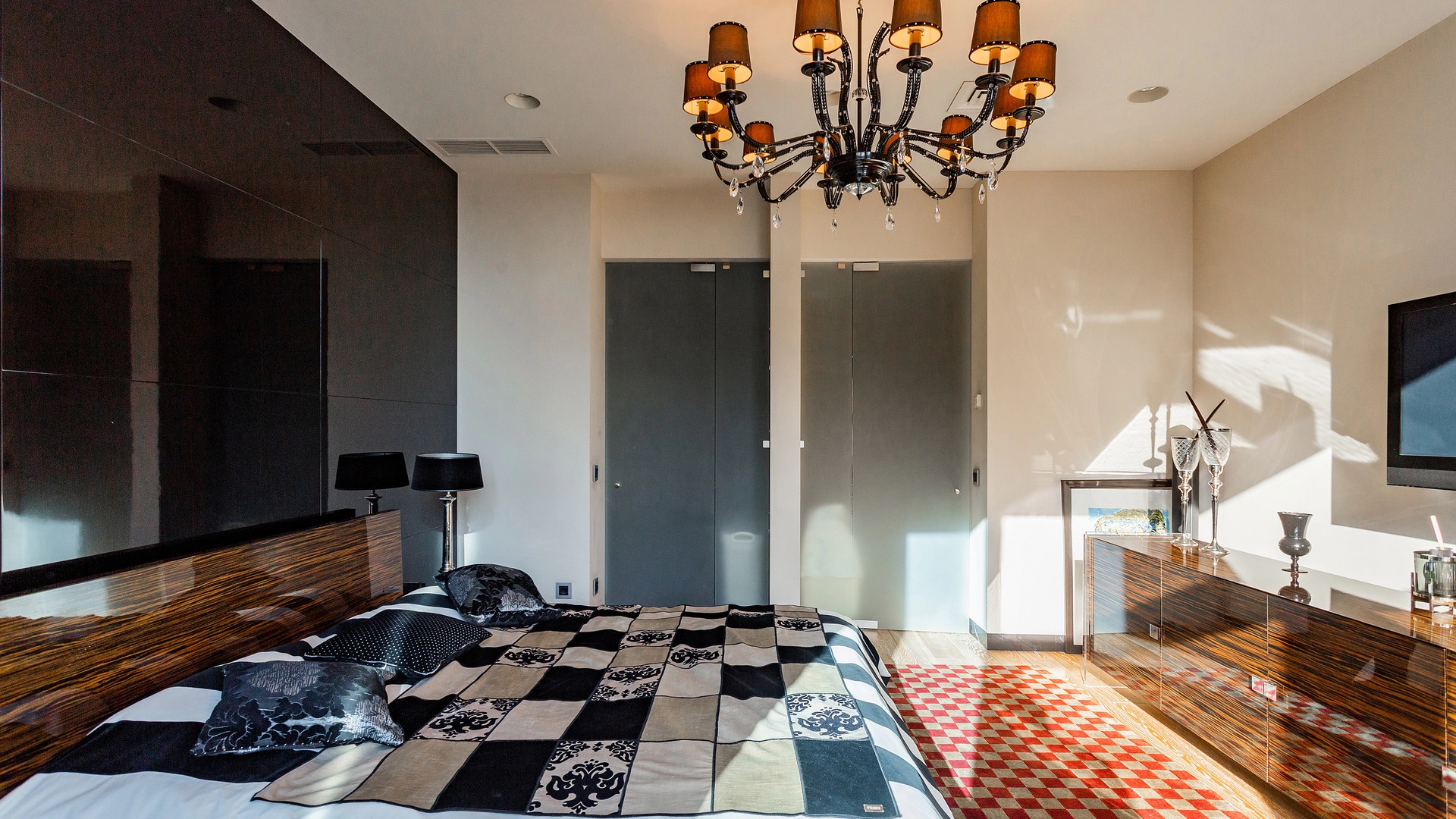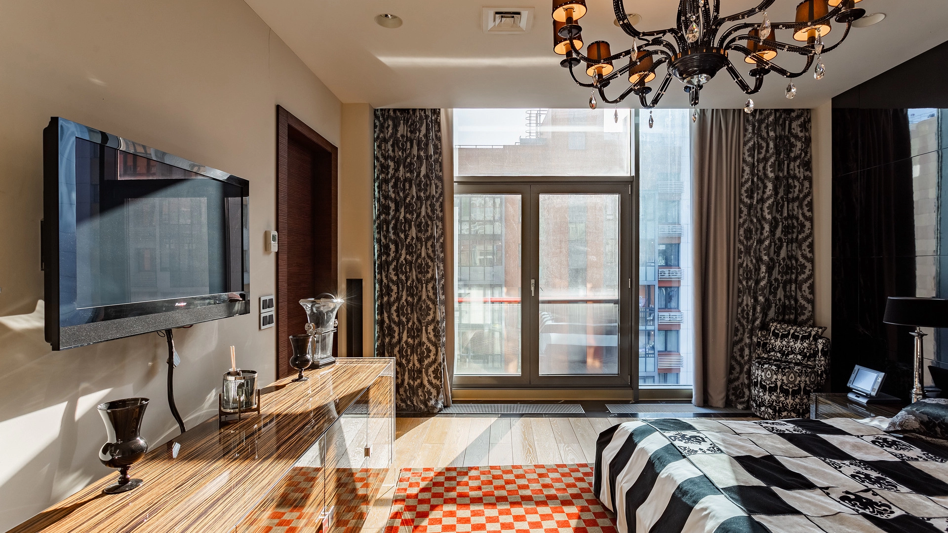 Квартира с двумя спальнями площадью 178 м² в клубном доме «Панорама» на седьмом этаже. Интерьер оформлен в эклектичном стиле по авторскому дизайн-проекту. В отделке использованы натуральные материалы. Благодаря панорамному остеклению и высоким потолкам пространство наполнено светом. Из окон открывается вид на столичные крыши и Собор Непорочного Зачатия Пресвятой Девы Марии.