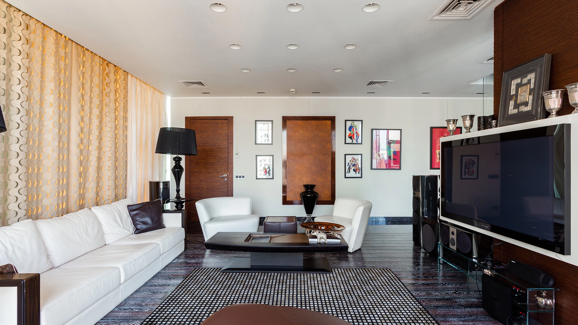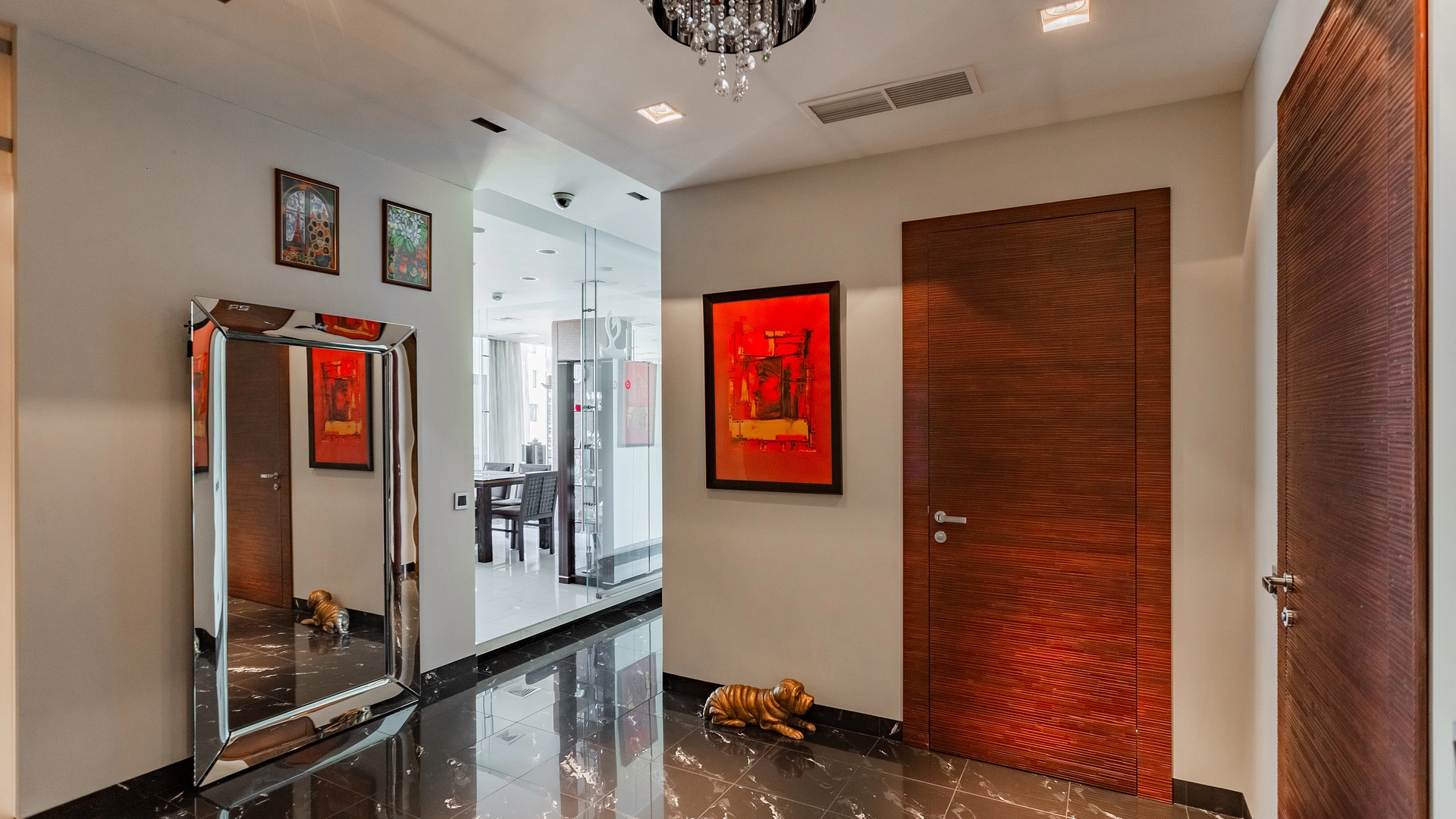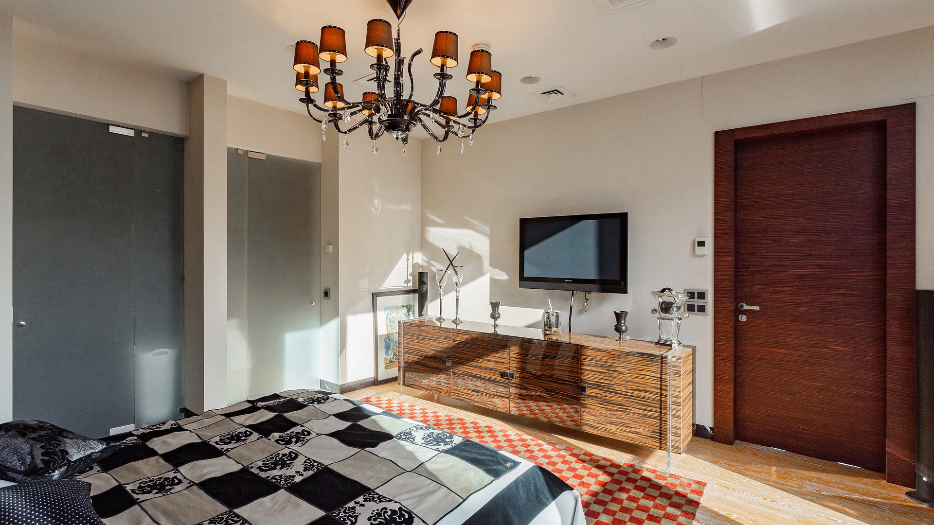 Функциональная планировка включает просторную кухню-гостиную, мастер-спальню со своим санузлом и гардеробной, вторую спальню с санузлом, гостевой санузел, гардеробную, постирочную и холл. Квартира меблирована, оборудована современной бытовой техникой.