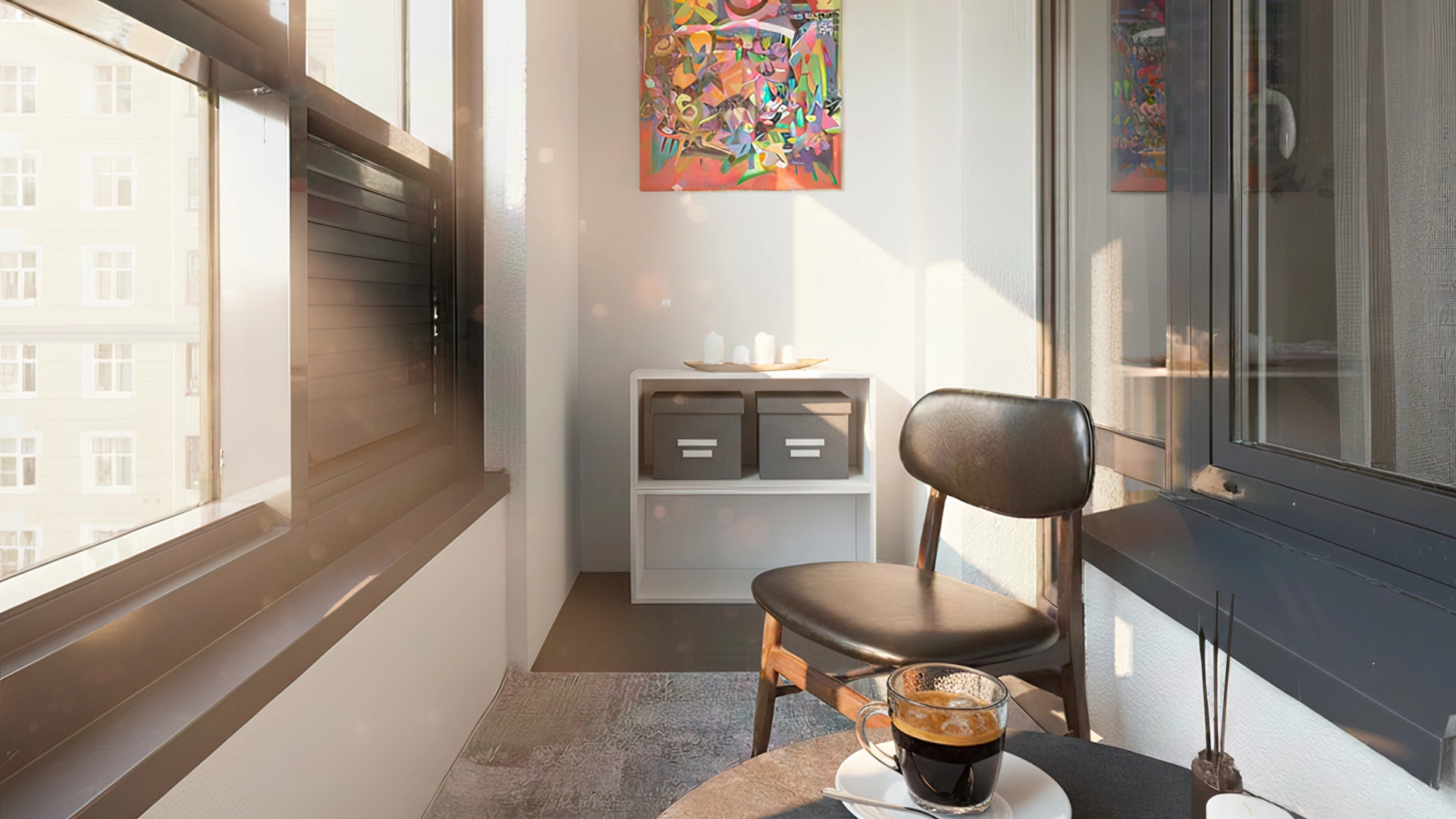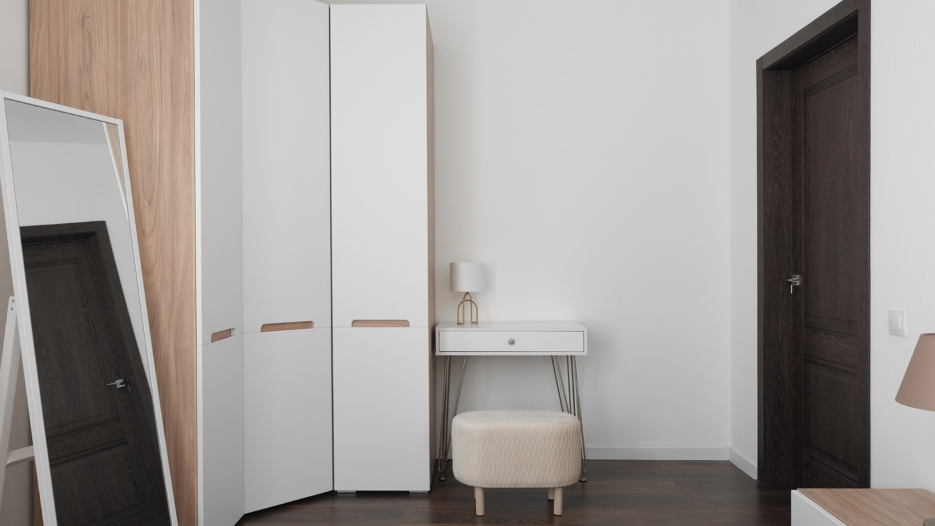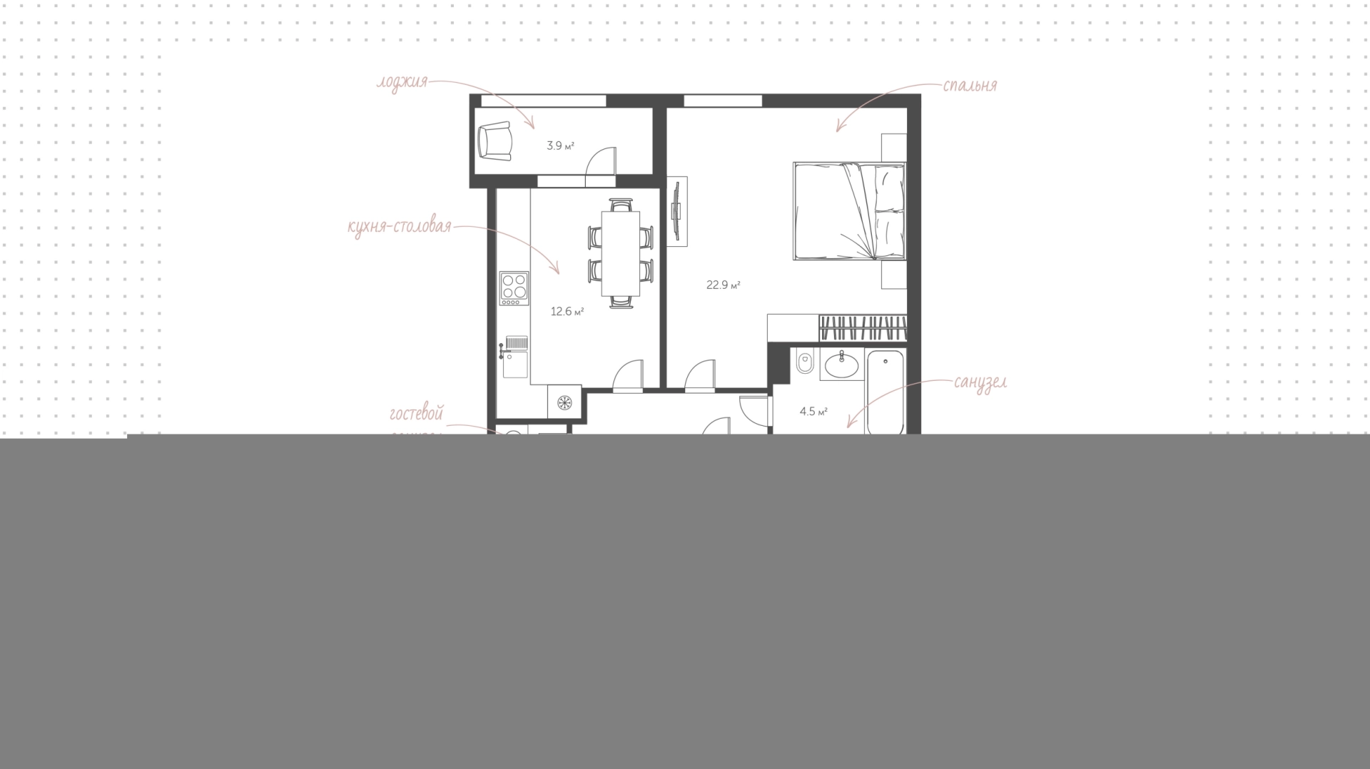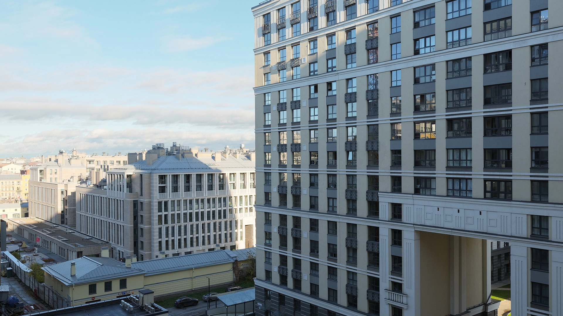 В одной из спален спланирована уютная зона отдыха, где можно встретить гостей или провести время за общением с близкими. Из кухни предусмотрен выход на лоджию — здесь достаточно места для организации рабочего места или лаунжа. Планировка также включает ванную комнату и гостевой санузел при входе. Большие окна наполняют комнаты естественным светом и теплом, открывая вид на крыши Санкт-Петербурга.