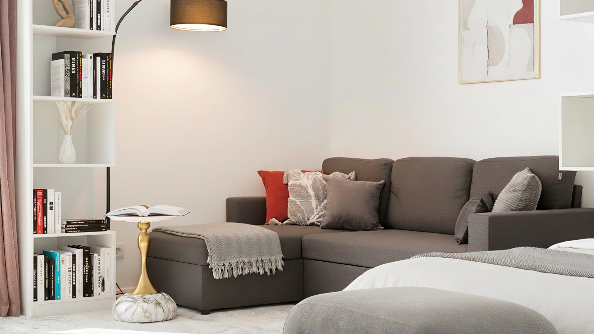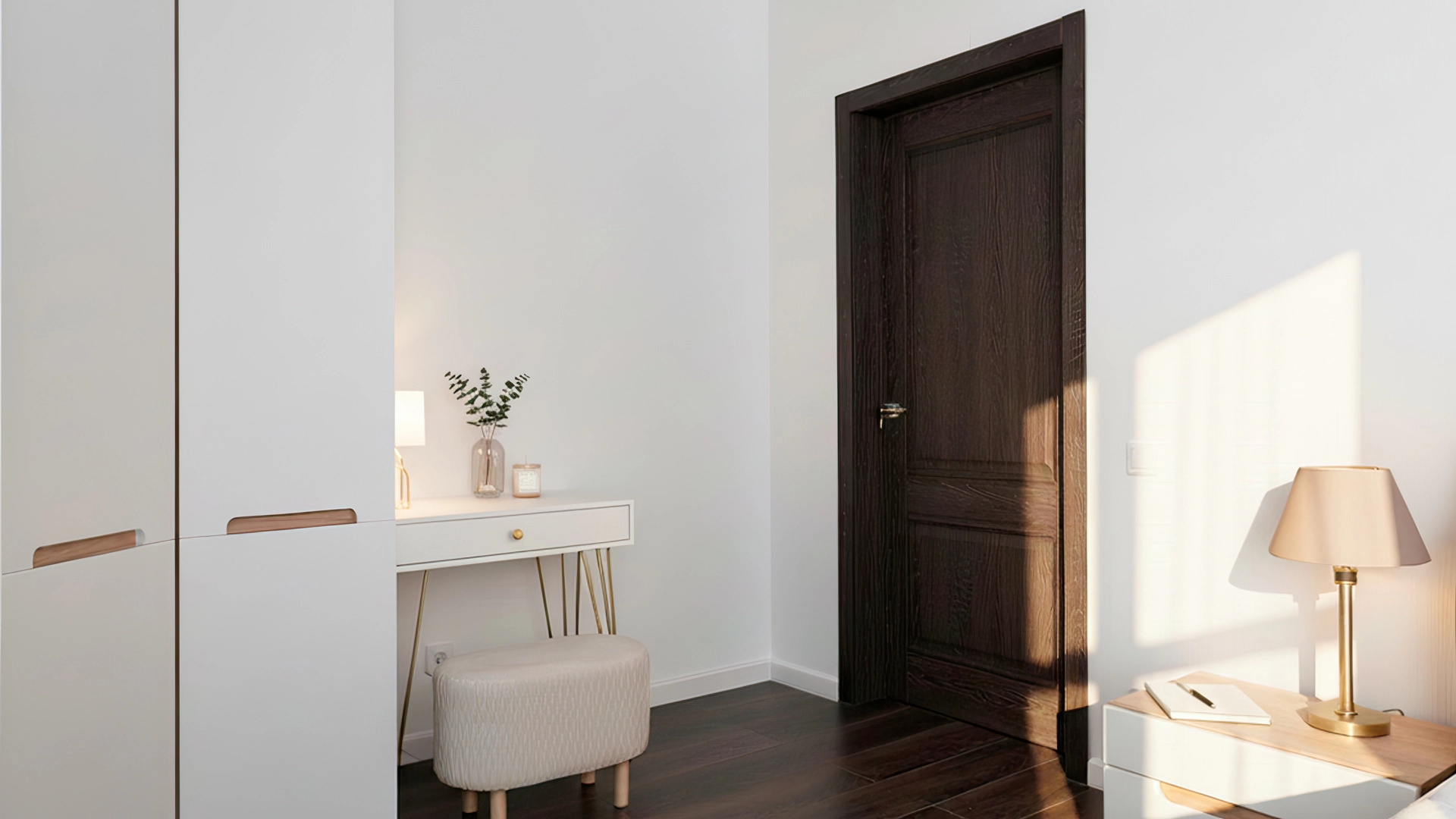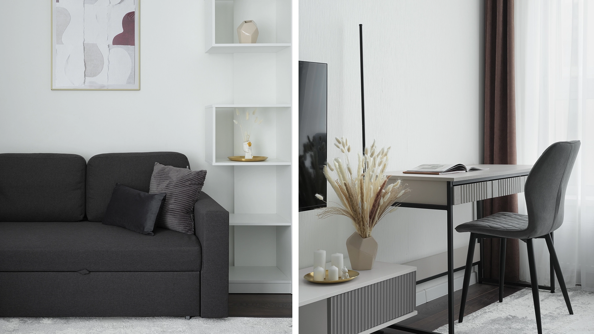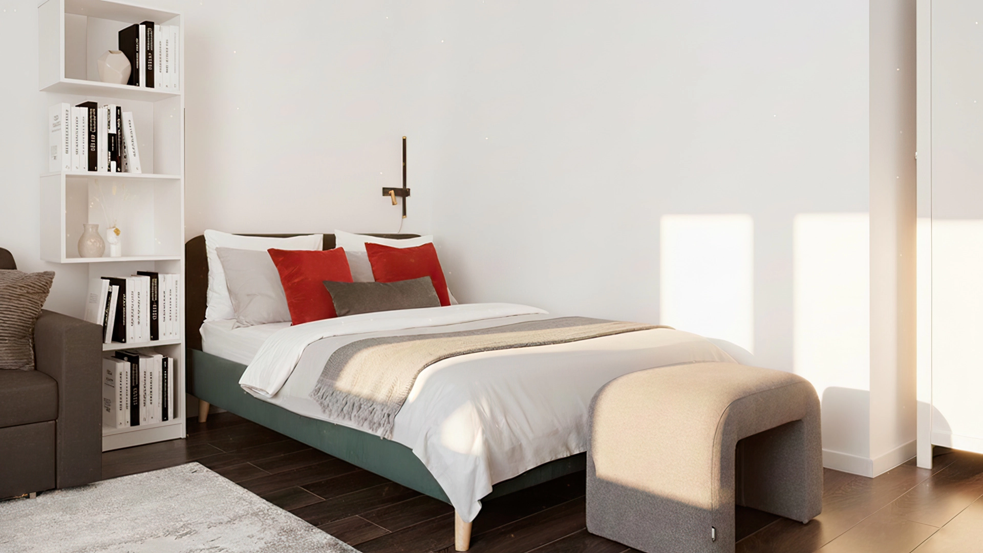 В одной из спален спланирована уютная зона отдыха, где можно встретить гостей или провести время за общением с близкими. Из кухни предусмотрен выход на лоджию — здесь достаточно места для организации рабочего места или лаунжа. Планировка также включает ванную комнату и гостевой санузел при входе. Большие окна наполняют комнаты естественным светом и теплом, открывая вид на крыши Санкт-Петербурга.