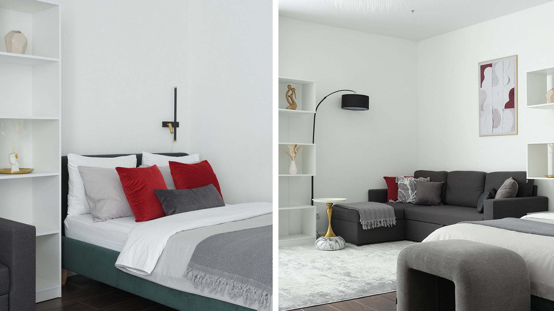 Апартаменты с 2 спальнями общей площадью 65 м² расположены на 9 этаже в жилом комплексе Promenade. Выполнена отделка в светлых тонах, на полу уложен ламинат с фактурой тёмного дерева. Интерьеры укомплектованы всей необходимой мебелью и техникой для вашего комфортного проживания. Текстиль контрастных оттенков, картины на стенах и другие элементы декора создают яркие акценты в интерьере.