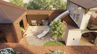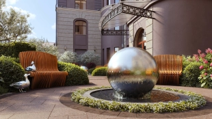 Во дворе «Дома Соболева» спроектированы уличная гостиная с диванами для отдыха и рабочая зона в тени деревьев. Центральным элемент — декоративная стена из меди и камня с логотипом проекта.