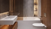 Планировка квартиры площадью 182 м² включает кухню-гостиную с обеденной зоной, мастер-спальню со своей гардеробной и санузлом с ванной и душевой, спальню с ванной комнатой, спальню с гардеробной, гостевой санузел, постирочную и прихожую с гардеробной. Планировка квартиры площадью 100 м² включает кухню-гостиную с обеденной зоной, мастер-спальню со своей гардеробной и санузлом с ванной и душевой, детскую спальню с гардеробной, гостевой санузел, постирочную и прихожую.