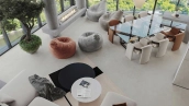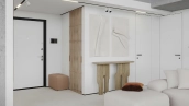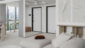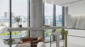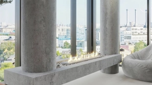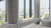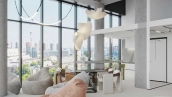 Планировка включает кухню-гостиную со вторым светом и биокамином, спальню со своей гардеробной, санузел и прихожую с гардеробной на первом уровне, на втором — мастер-спальню со своей гардеробной, ванной и кабинетом. Из панорамных окон открываются виды на город.