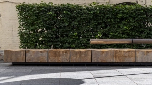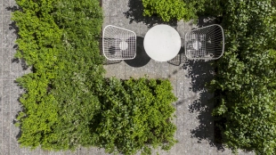 Во дворе «Дома Соболева» спроектированы уличная гостиная с диванами для отдыха и рабочая зона в тени деревьев. Центральным элемент — декоративная стена из меди и камня с логотипом проекта.