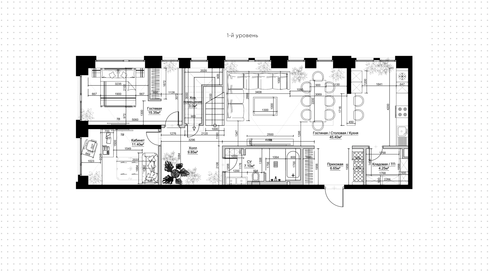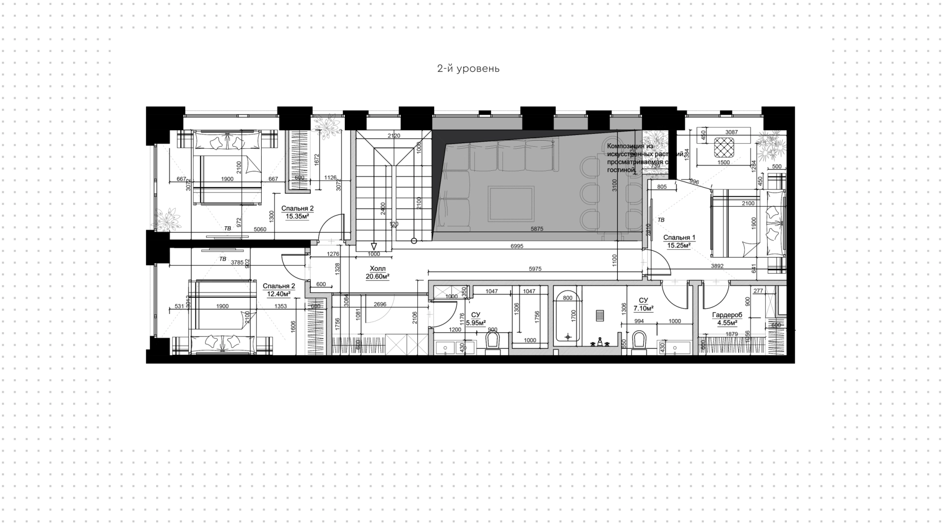 1-й уровень: гостиная-столовая-кухня со вторым светом, спальня с гардеробной, кабинет, ванная комната, кладовая. 2-й уровень: мастер-спальня с гардеробной и ванной комнатой, спальня с гардеробной, четвёртая спальня, ванная комната, холл.