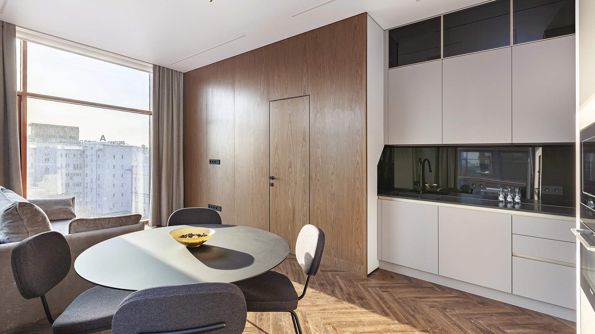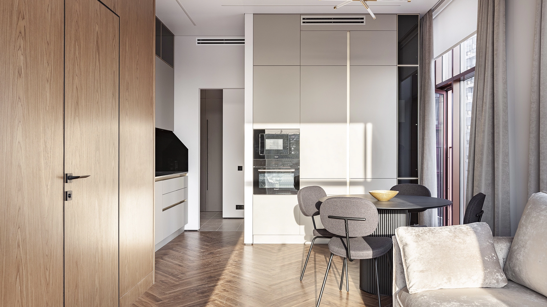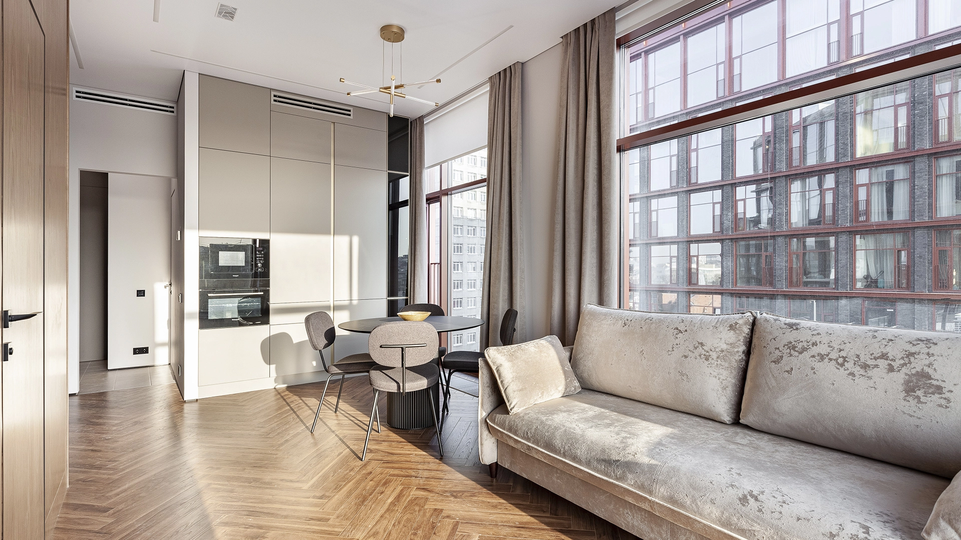 Интерьер укомплектован мебелью и встроенной бытовой техникой Weissgauff — варочная панель, духовой шкаф, микроволновая печь, посудомоечная машина, вытяжка, холодильник. Функциональная планировка: кухня-гостиная, две спальни, два санузла, прихожая. Пять широких панорамных окон «в пол» наполняют пространство естественным светом, открывая виды на город.