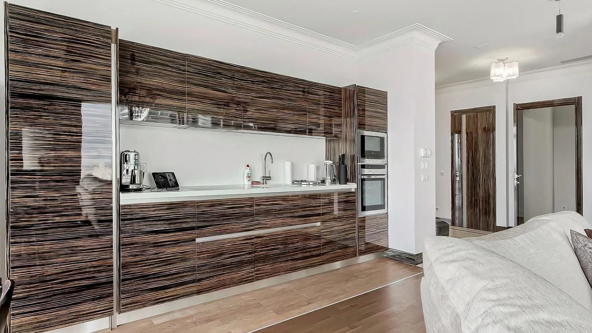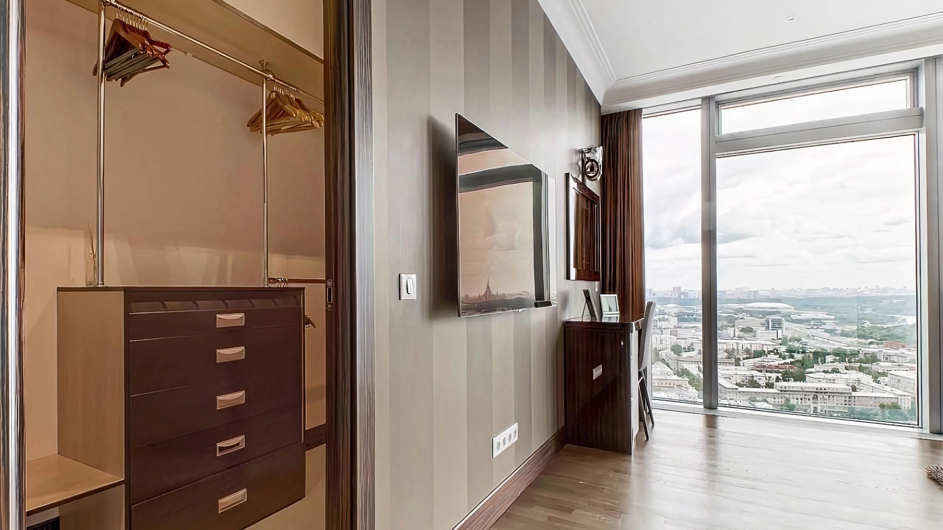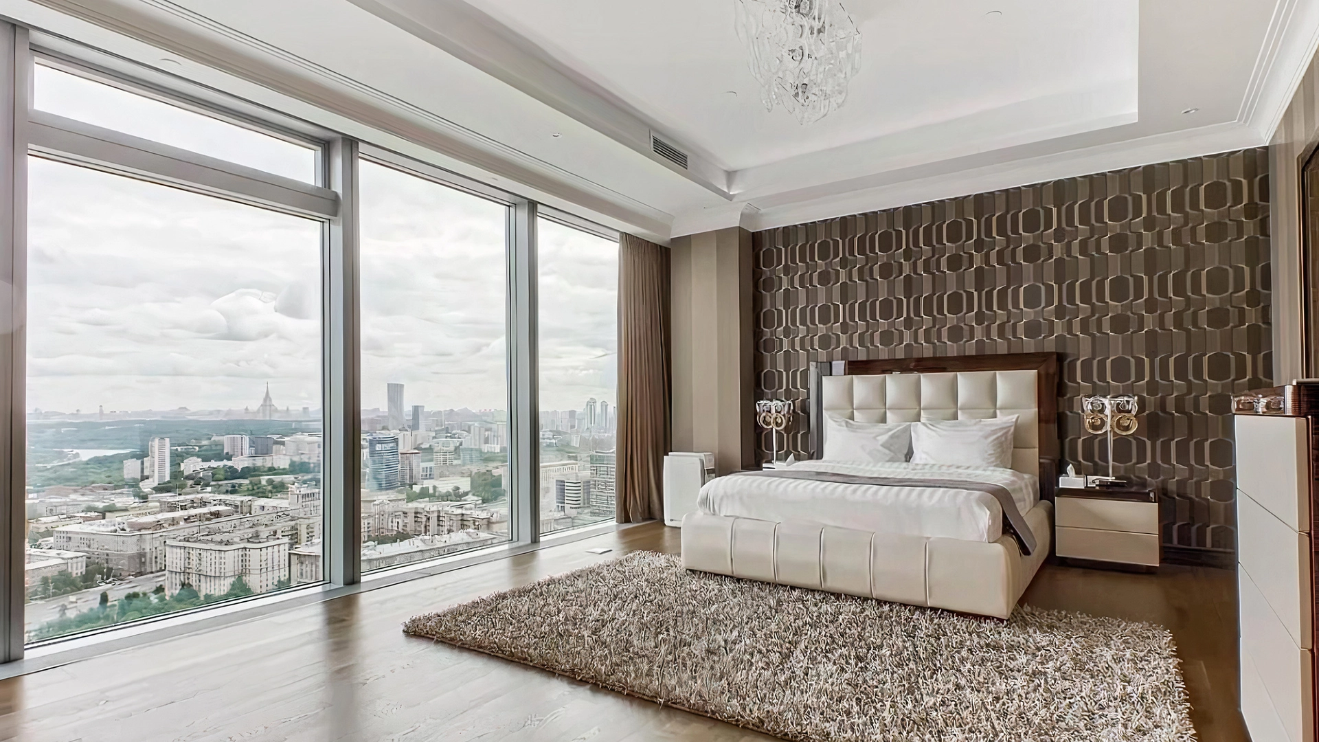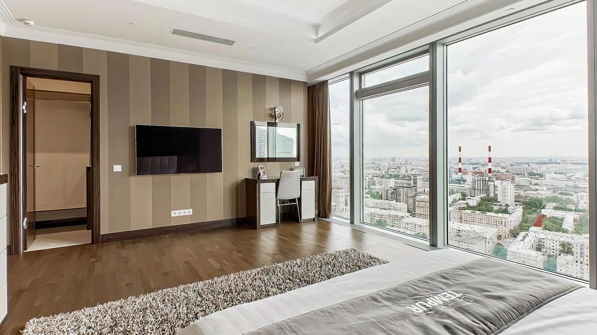Видовые апартаменты с 2-мя спальнями общей площадью 189 м² в комплексе небоскрёбов «Город Столиц». Апартаменты расположены на 34-м этаже в «Золотом углу» башни «Санкт-Петербург». Интерьер оформлен в современном стиле в лаконичных светлых тонах. Спланирована кухня-гостиная с обеденной зоной, 2 мастер-спальни с гардеробными и санузлами, гостевой санузел, постирочная, холл. Апартаменты полностью укомплектованы мебелью и бытовой техникой. Из окон открывается вид на Москву-реку, Кремль, стадион «Лужники», храм Христа Спасителя.