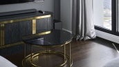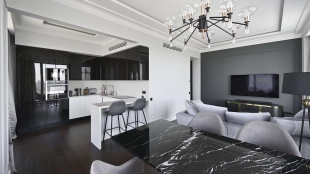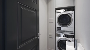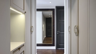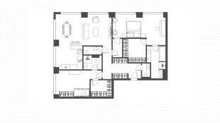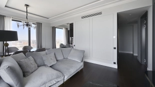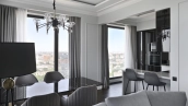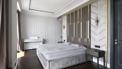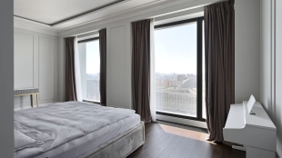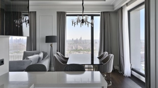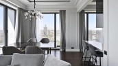Функциональная планировка: кухня-гостиная, мастер-спальня с собственной гардеробной и ванной, вторая спальня со своим санузлом, гостевой санузел, гардеробная, кладовая, прихожая. Благодаря панорамному остеклению пространство наполнено естественным светом, открываются виды на Ходынский бульвар и на «Триумф-Палас».