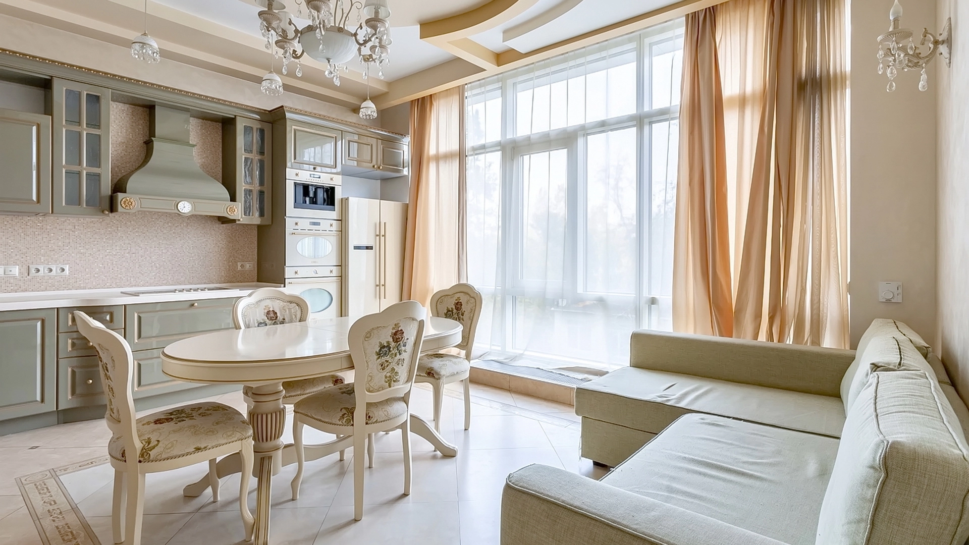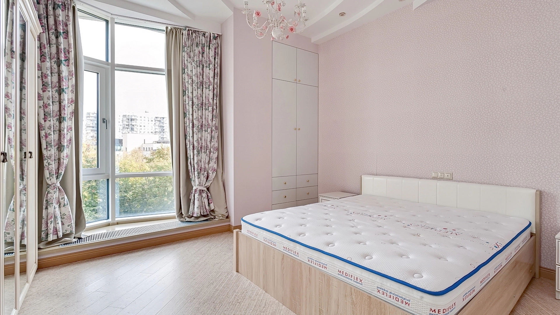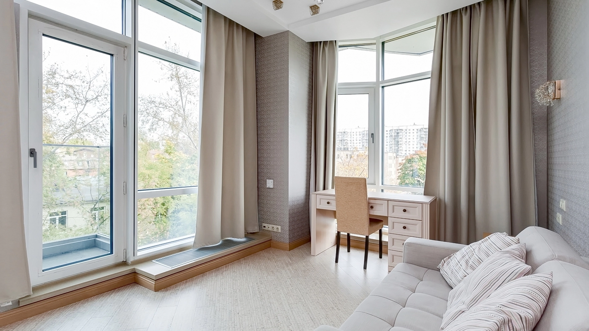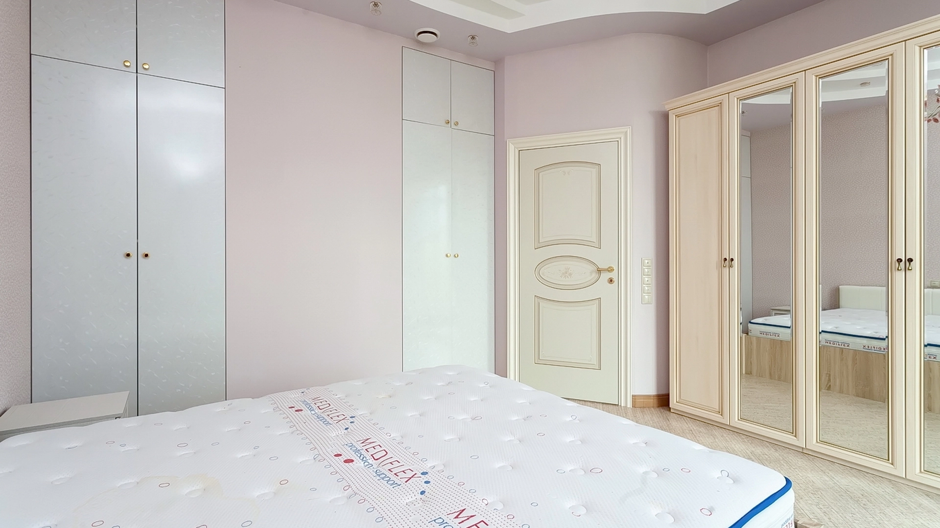 Квартира с 3-мя спальнями общей площадью 109 м² в комплексе Barkli Park на 3 этаже. Выполнен дизайнерский ремонт в классическом стиле. Интерьер выдержан в приятных пастельных тонах, полы выложены светлым деревом и крупной плиткой. Белые многоуровневые потолки с подвесными люстрами, шторы из портьерной ткани. Установлена итальянская мебель, кухня со встроенной бытовой техникой. На кухне стены украшены художественной росписью и мозаикой.