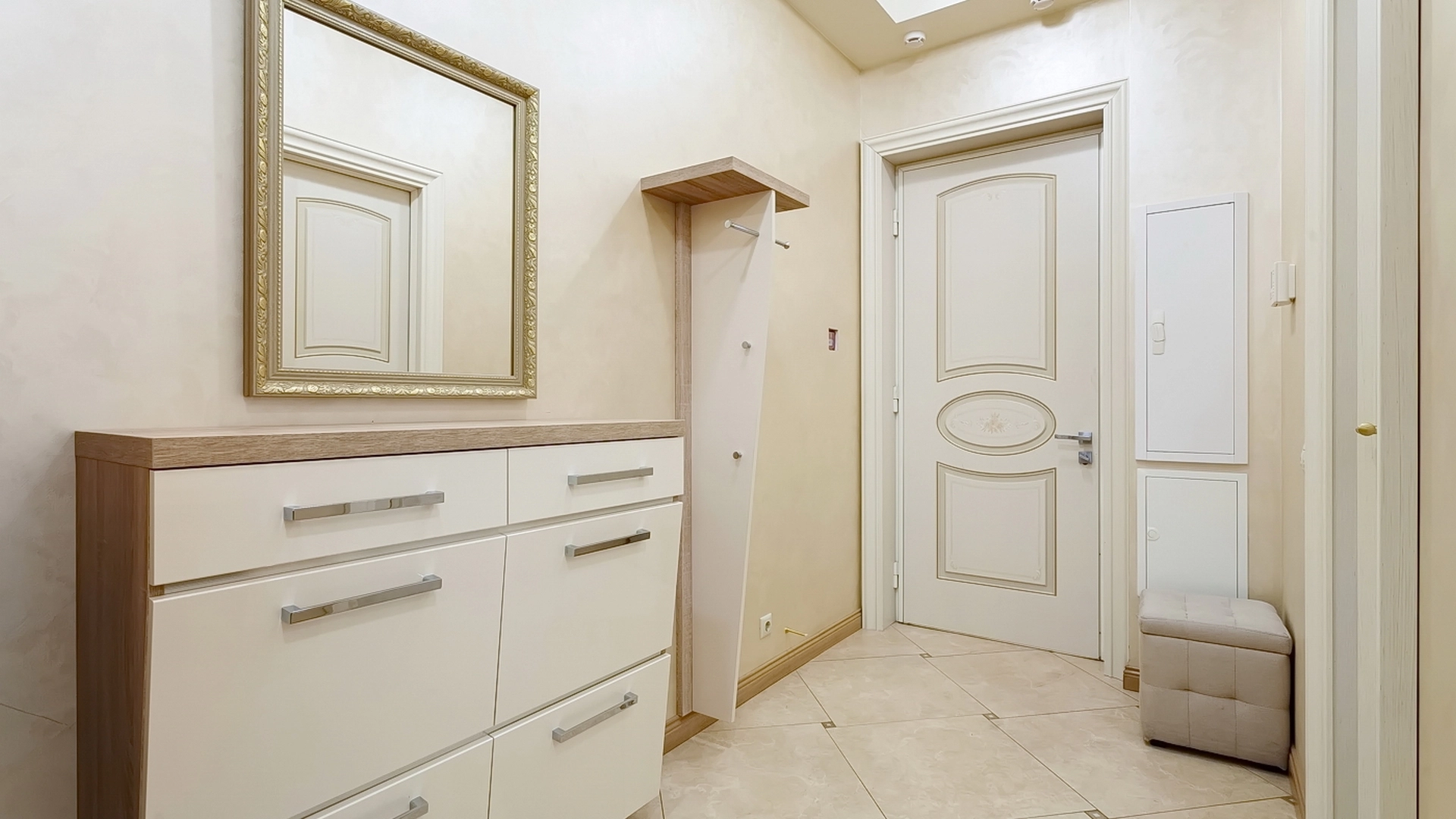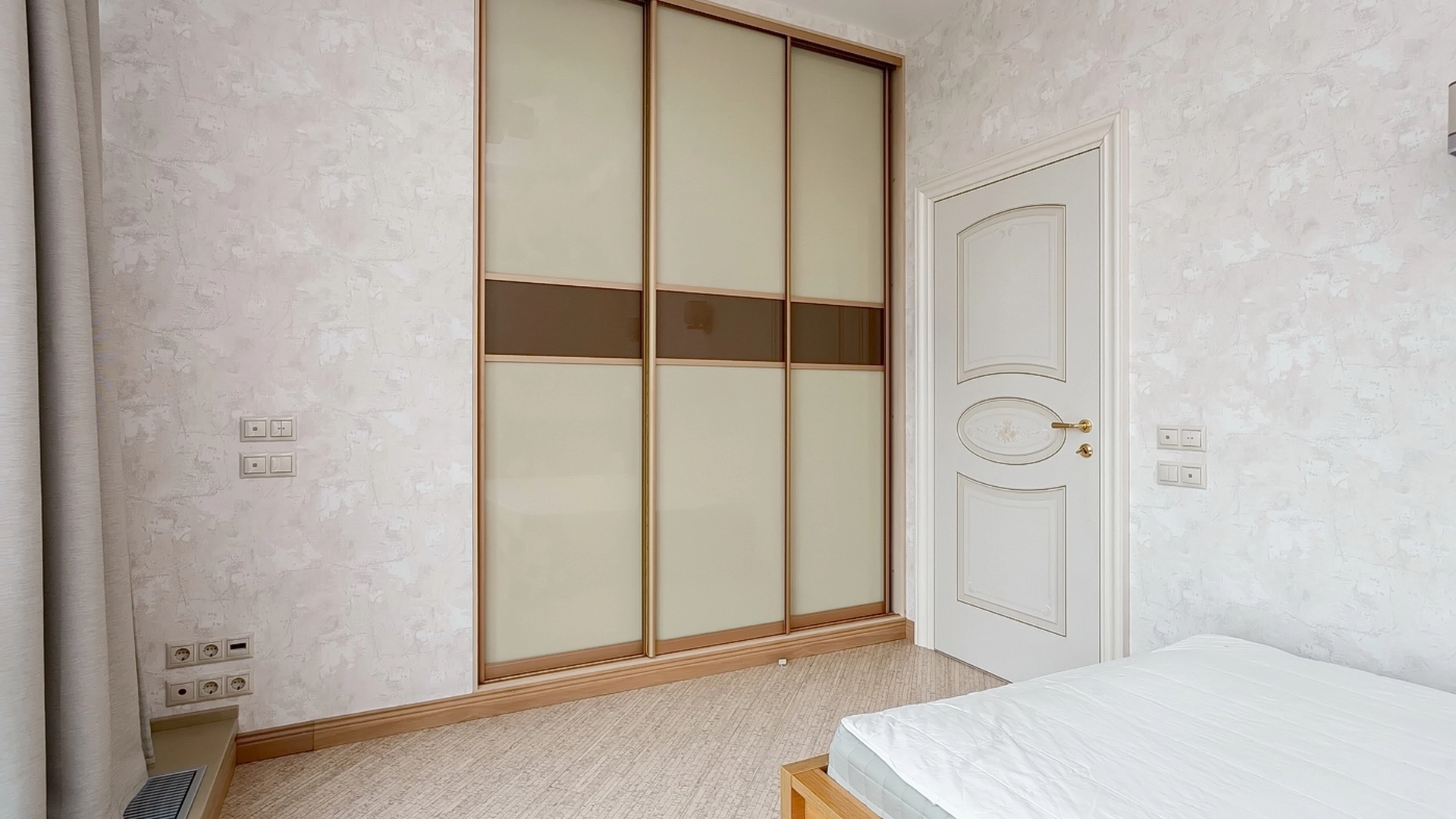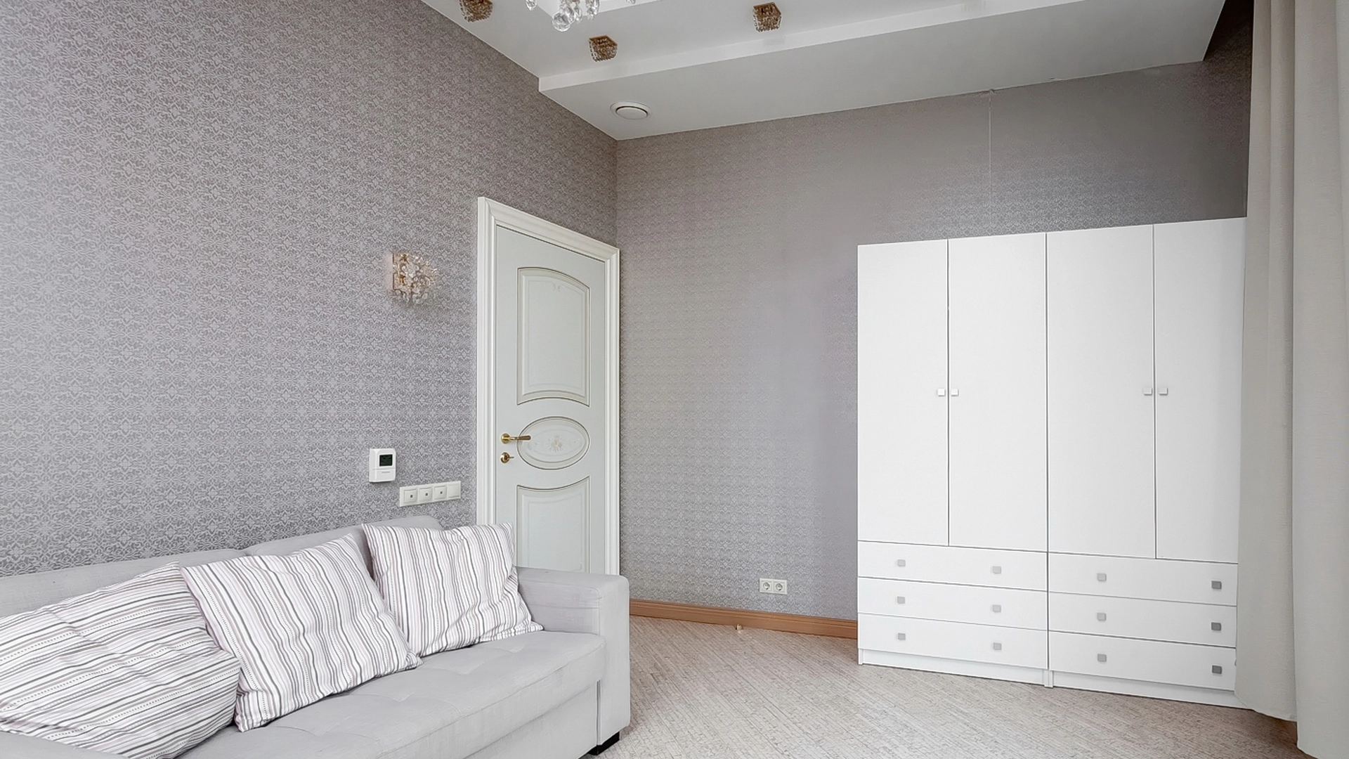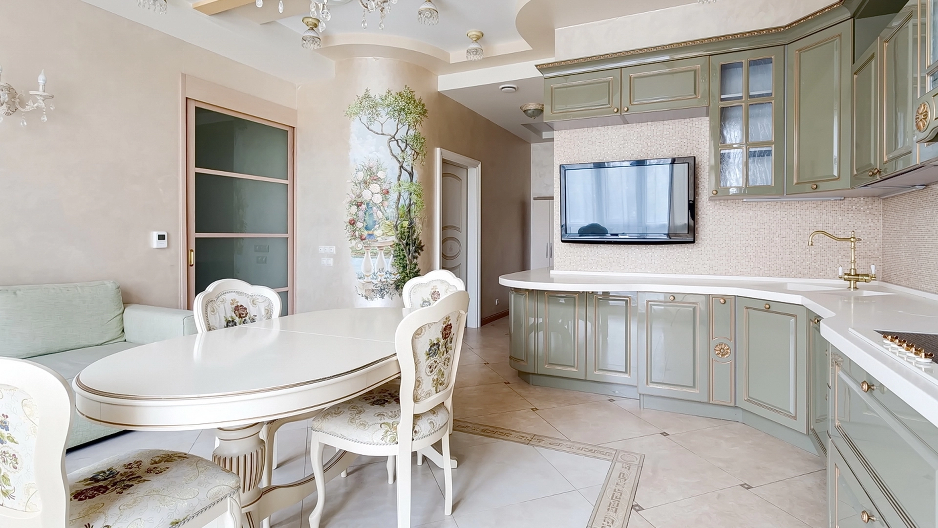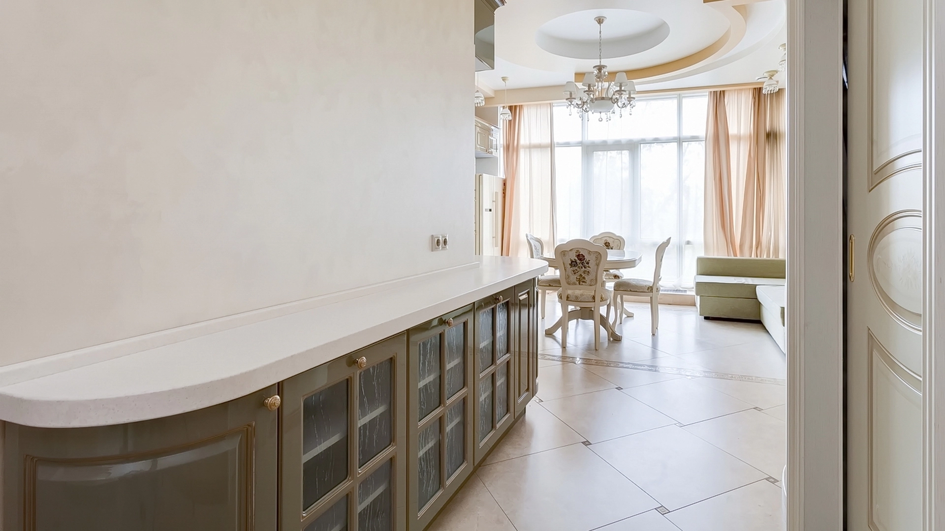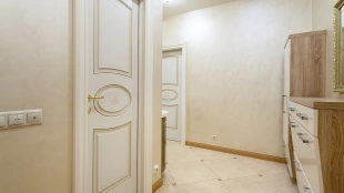 Планировка: кухня-гостиная, 3 спальни, 2 санузла, постирочная комната, гардеробная, балкон. В одном из санузлов большая угловая ванная, зеркала в резных золотистых рамах, второй санузел с душевой кабиной. Из панорамных окон открываются виды на собор Преображения и внутреннюю территорию комплекса. Машиноместо не входит в стоимость.