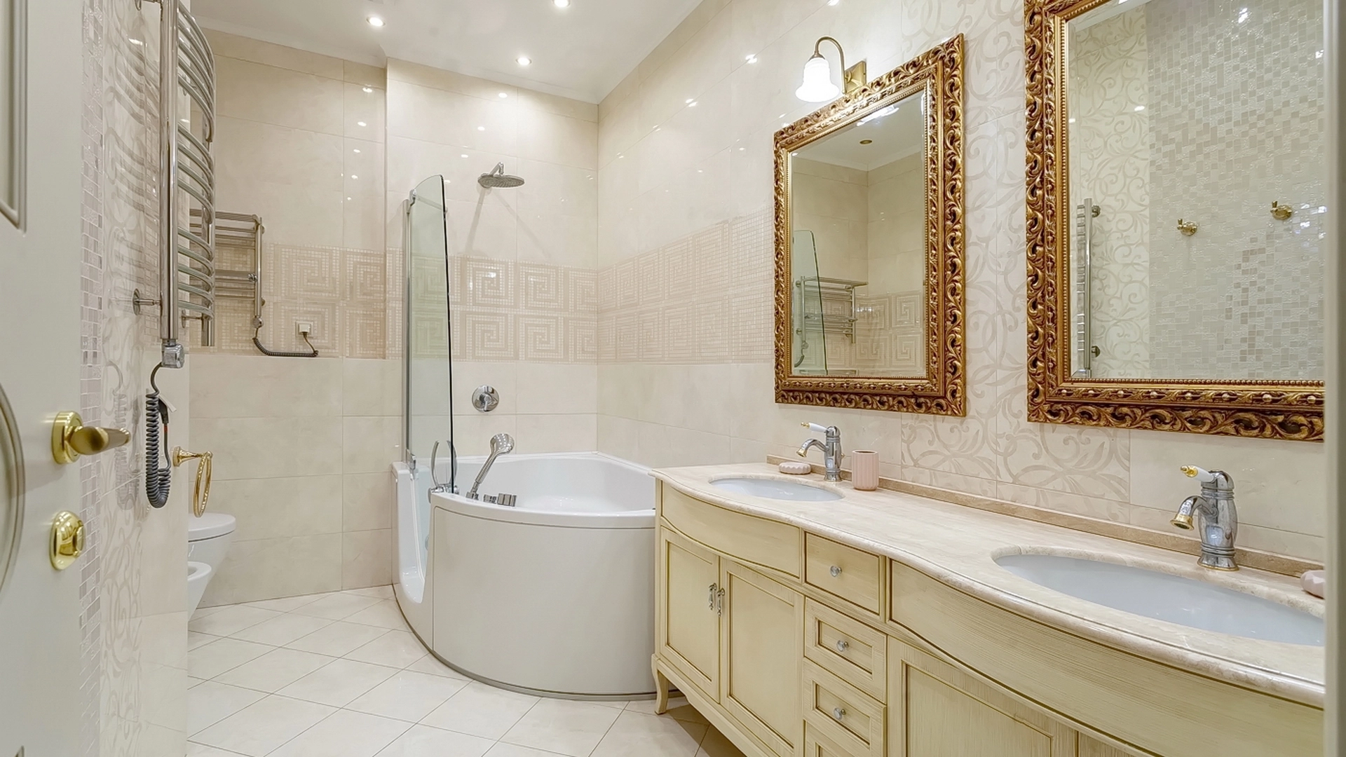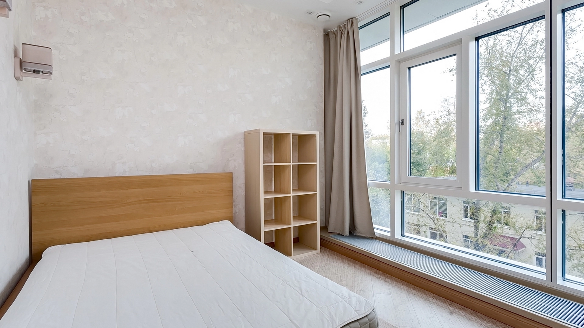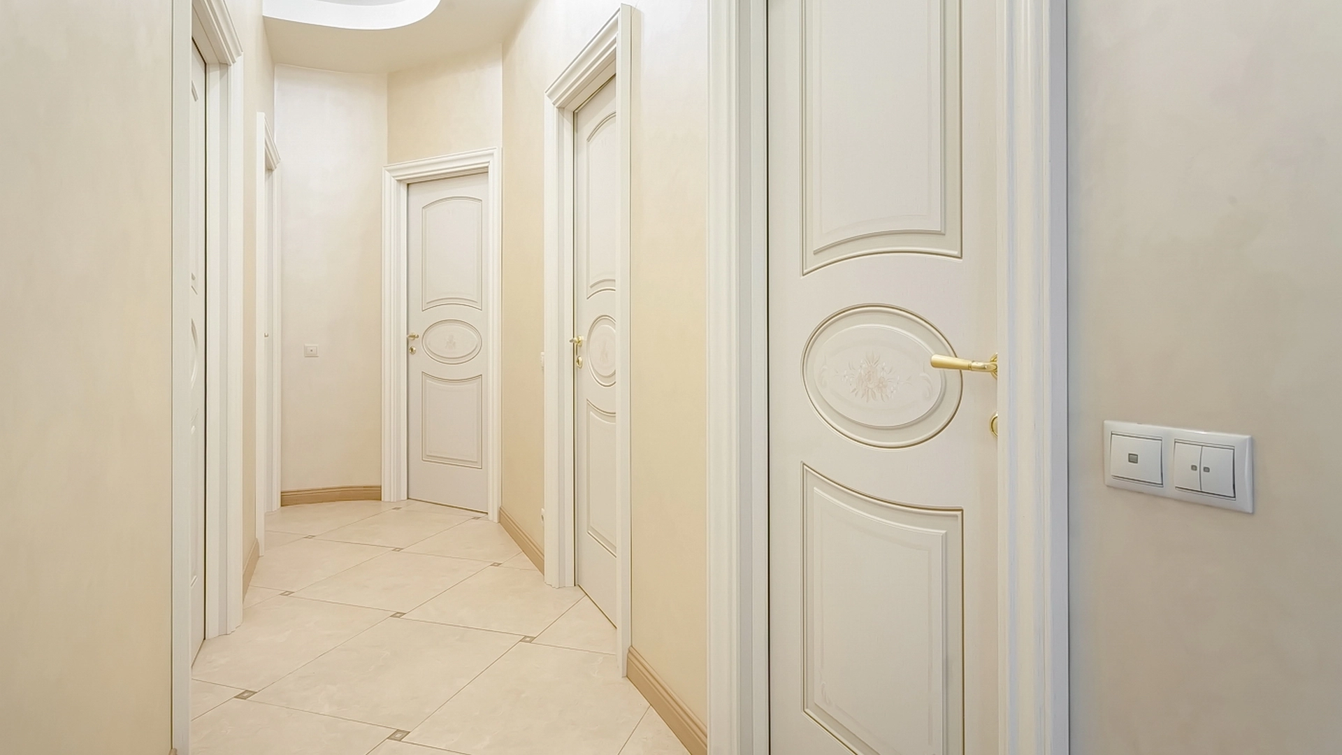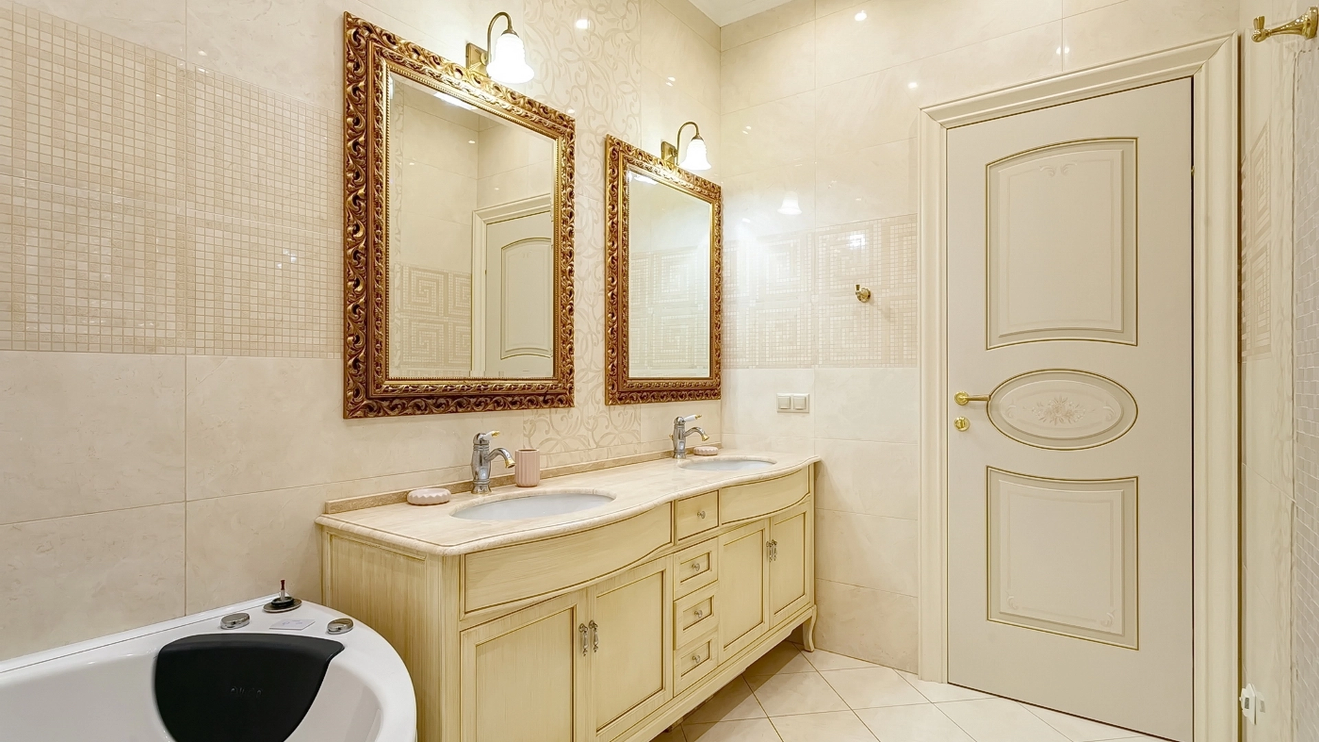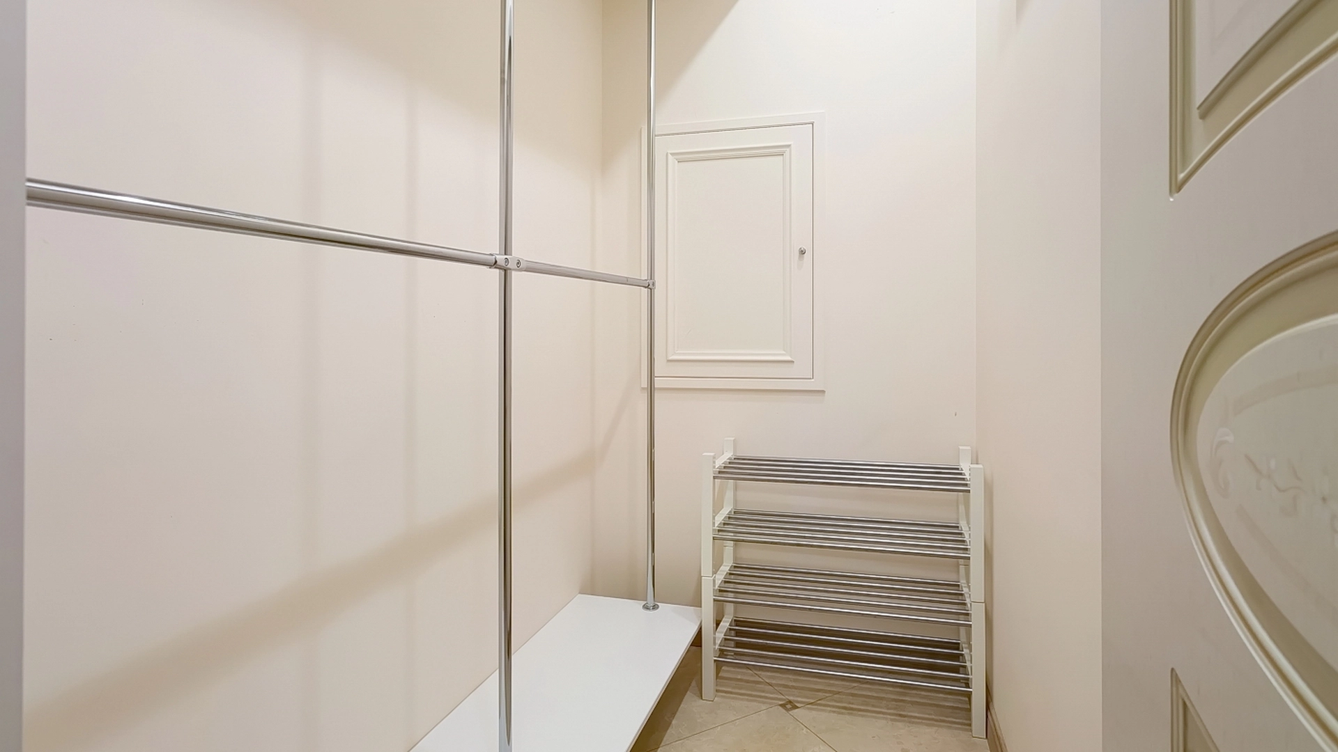 Планировка: кухня-гостиная, 3 спальни, 2 санузла, постирочная комната, гардеробная, балкон. В одном из санузлов большая угловая ванная, зеркала в резных золотистых рамах, второй санузел с душевой кабиной. Из панорамных окон открываются виды на собор Преображения и внутреннюю территорию комплекса. Машиноместо не входит в стоимость.