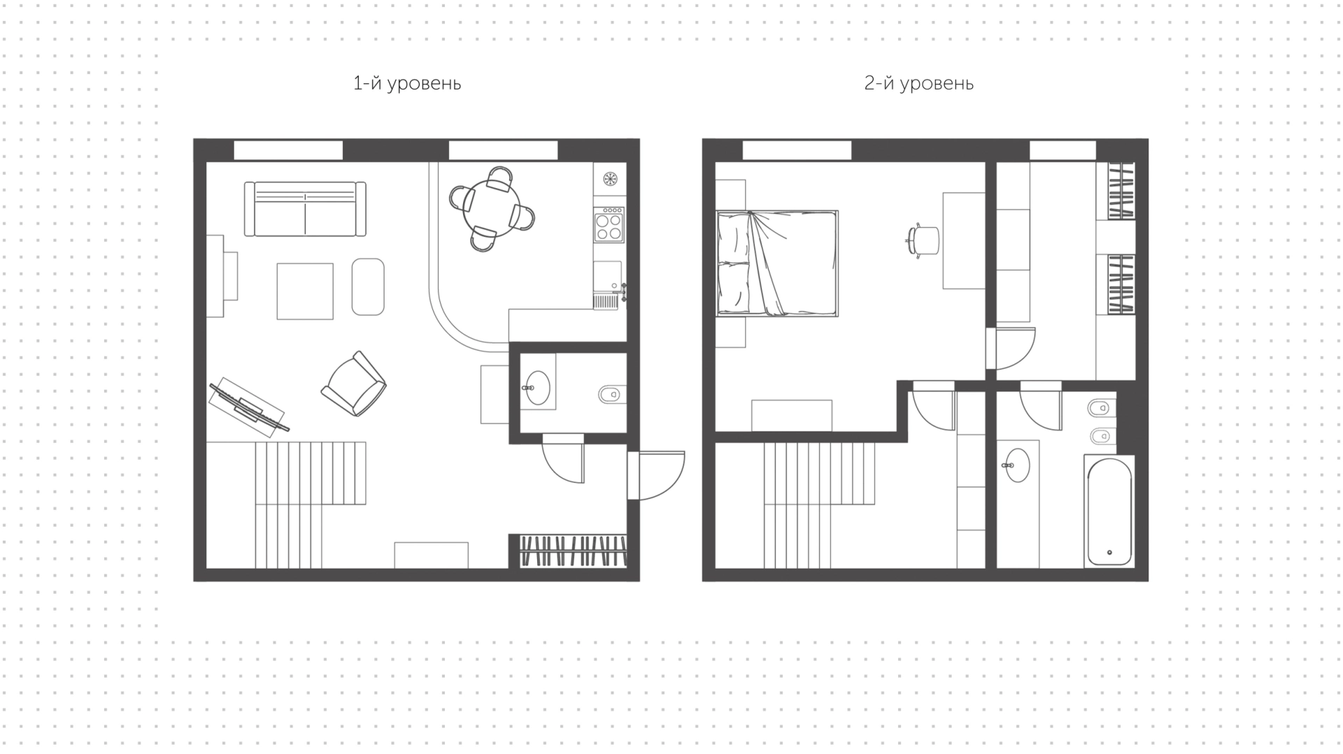 На 1-м уровне спланирована просторная кухня-гостиная с обеденной зоной, гостевой санузел, гардеробная, прихожая. Планировка 2-го уровня включает мастер-спальню с гардеробной и ванной комнатой, коридор с библиотекой. В квартире установлены подогрев полов, система вентиляции и кондиционирования Daikin. Окна квартиры выходят во двор, что создает постоянную атмосферу тишины и покоя. Предусмотрено машиноместо в подземном паркинге.
