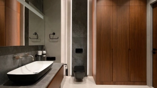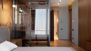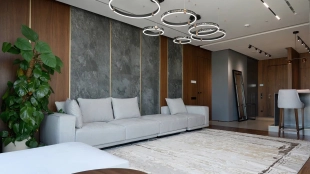 Функциональная планировка включает кухню-гостиную с обеденной зоной, мастер-спальню с собственной ванной и гардеробной, холл. Благодаря панорамным окнам пространство наполнено естественным светом, открываются виды на север города и башни «Москва-Сити».