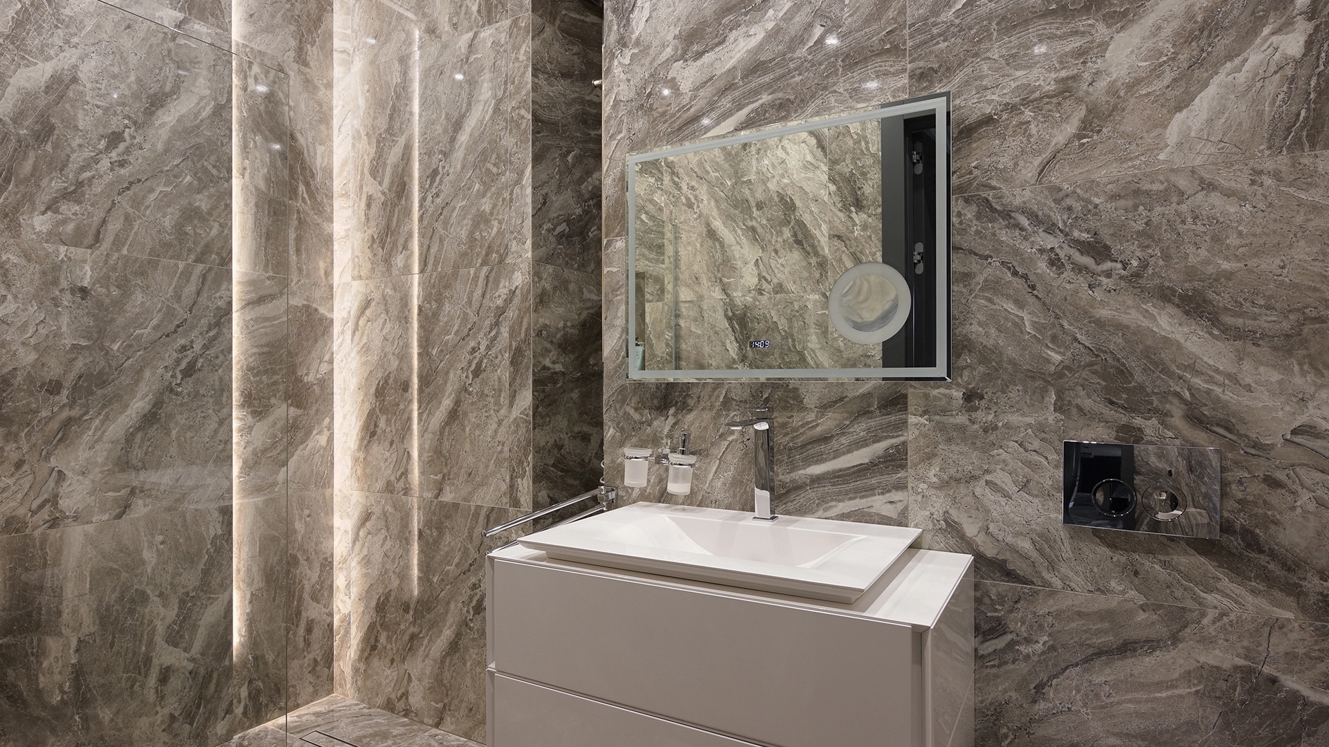 Просторная квартира с 2-мя спальнями в комплексе премиум-класса «Воробьев дом» в районе Раменки. Квартира общей площадью 99 м² расположена на 2-м этаже. Выполнена авторская отделка в современном стиле, на полу уложены паркетная доска из массива дуба от шведской компании Kahrs и плитка. Итальянская кухня Cesar с мраморной столешницей оборудована бытовой техникой Kuppersbusch и Miele. Сантехника представлена брендом GD porcelanosa.