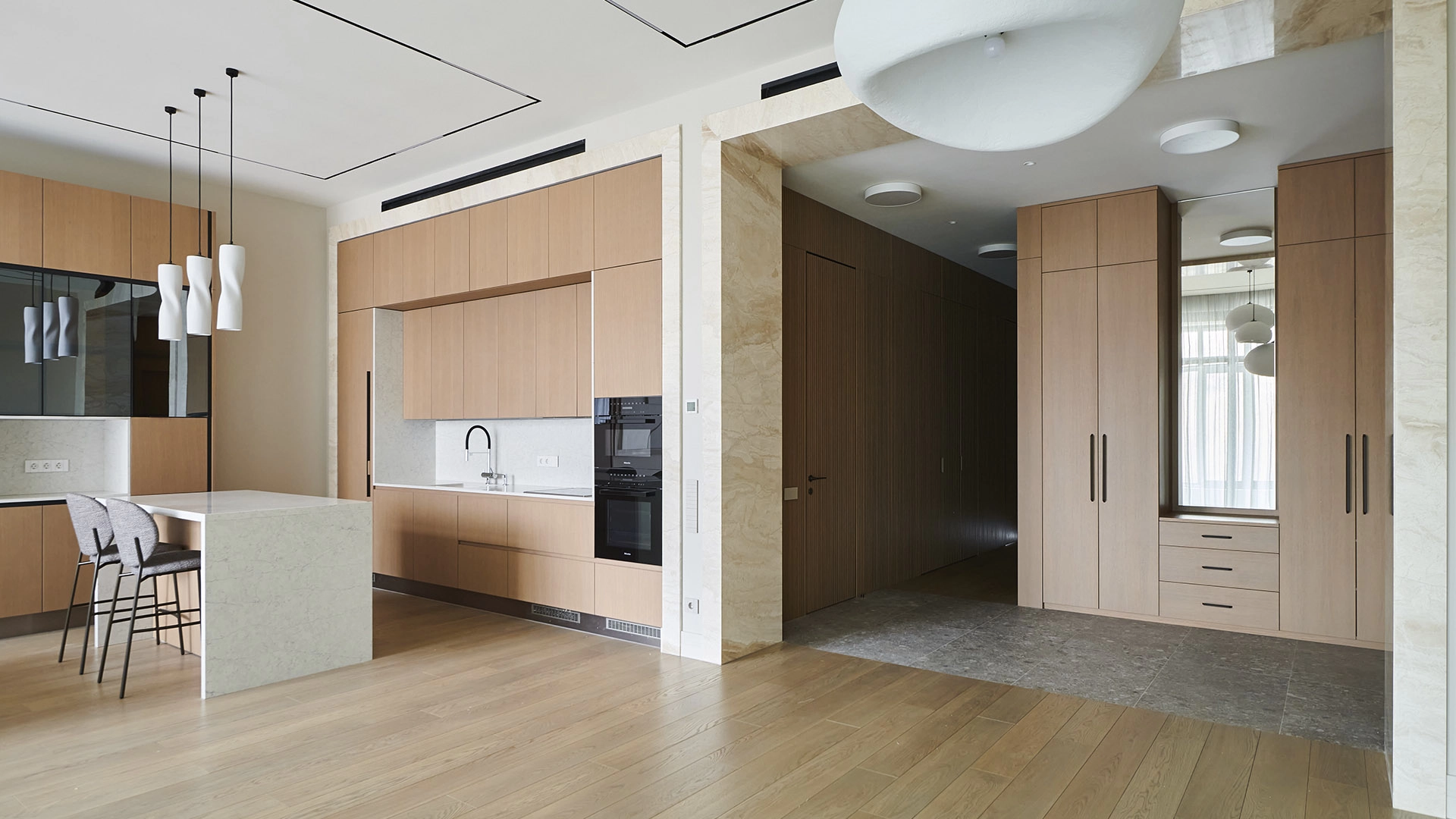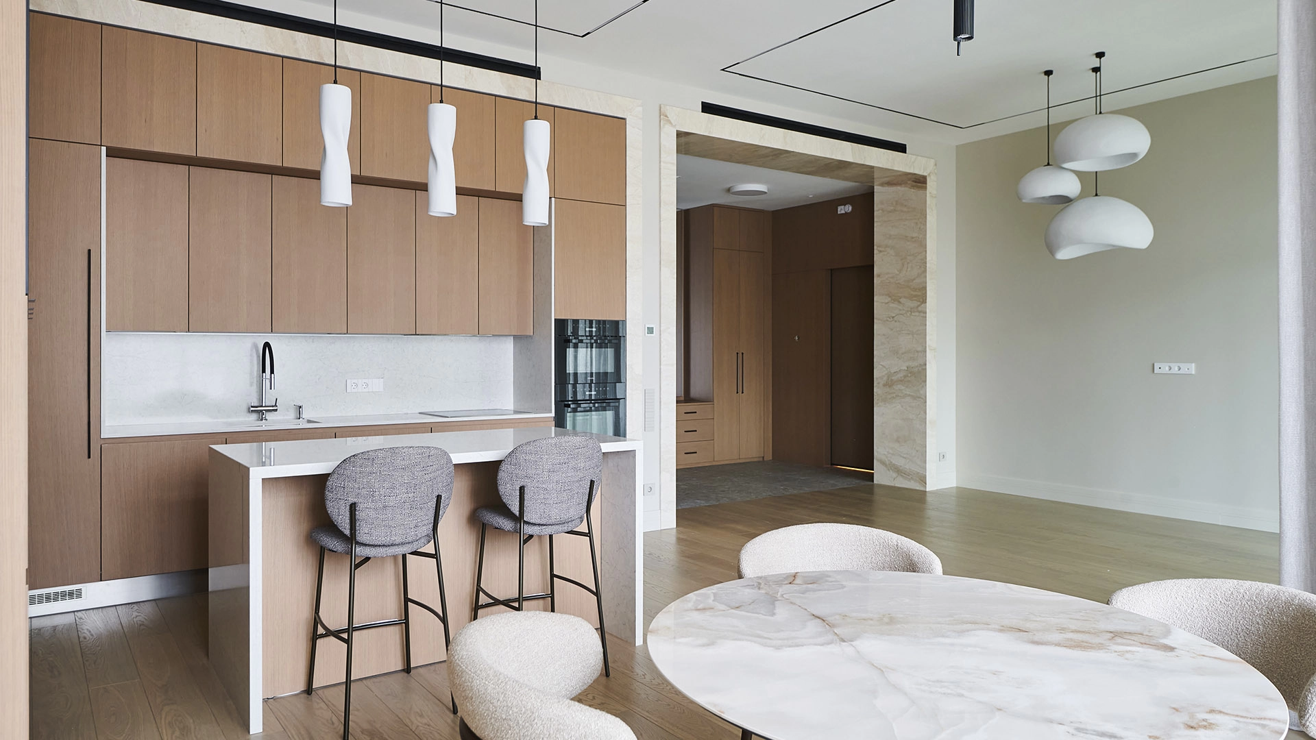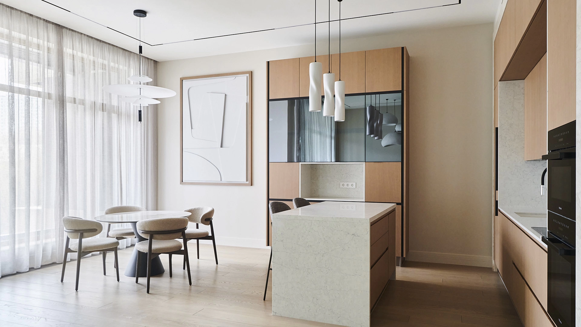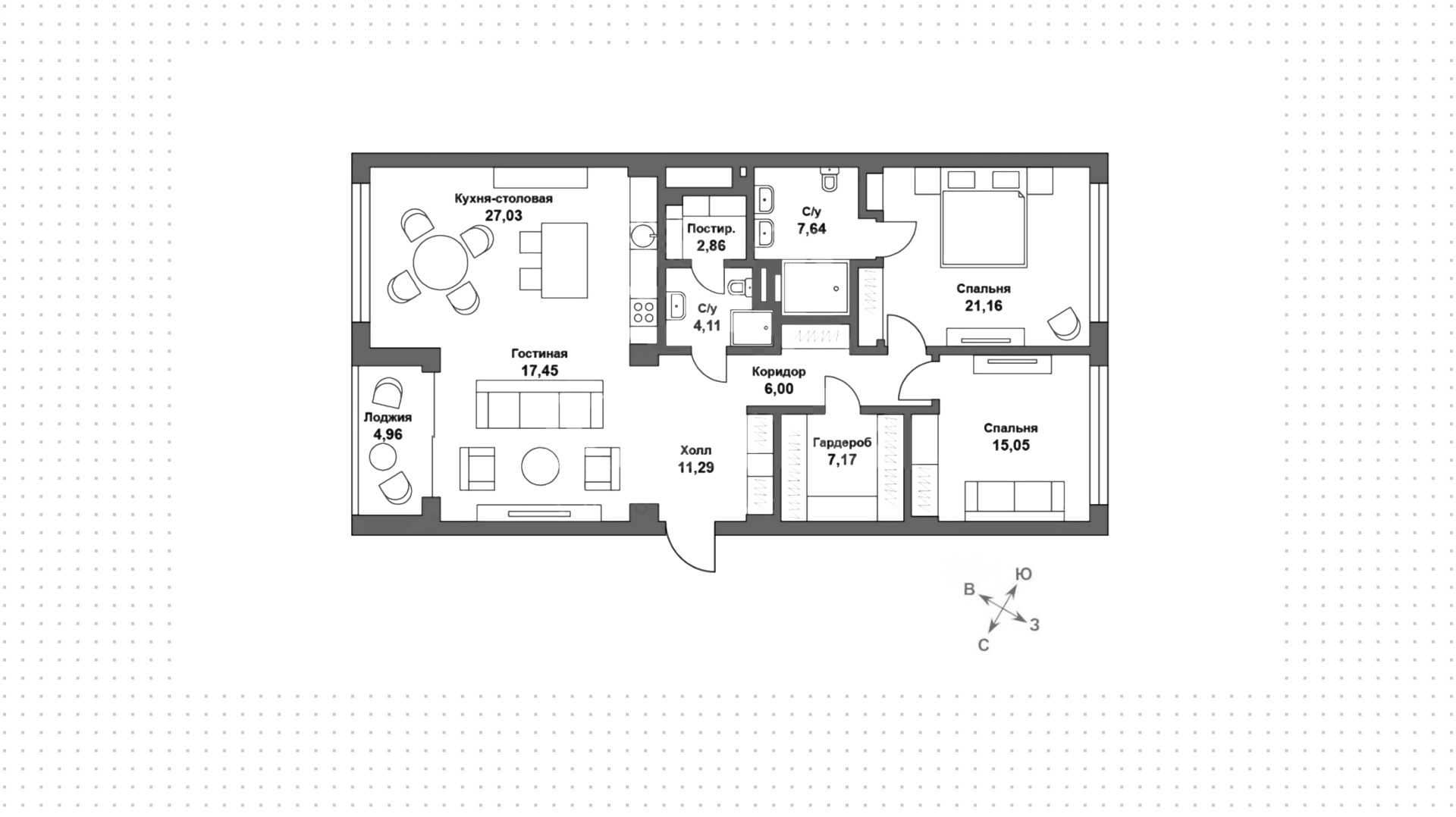Функциональная планировка включает кухню-гостиную с обеденной зоной и выходом на лоджию, мастер-спальню с собственным санузлом, вторую спальню, гостевой санузел, гардеробную, постирочную и холл. Благодаря панорамному остеклению пространство наполнено естественным светом и теплом, открываются виды на парк и благоустроенную территорию комплекса.