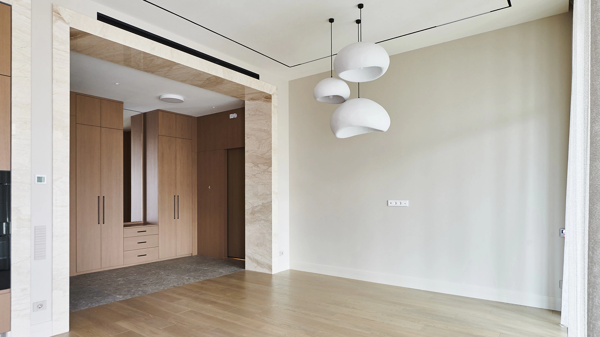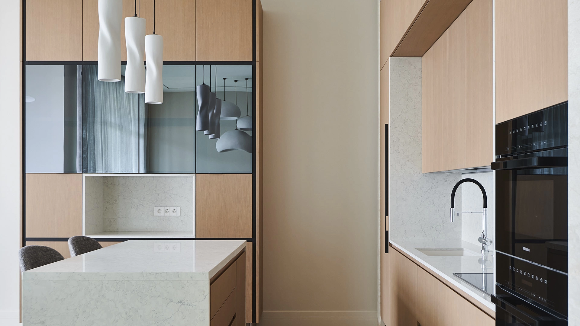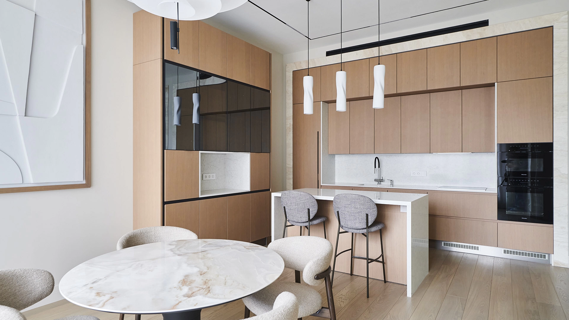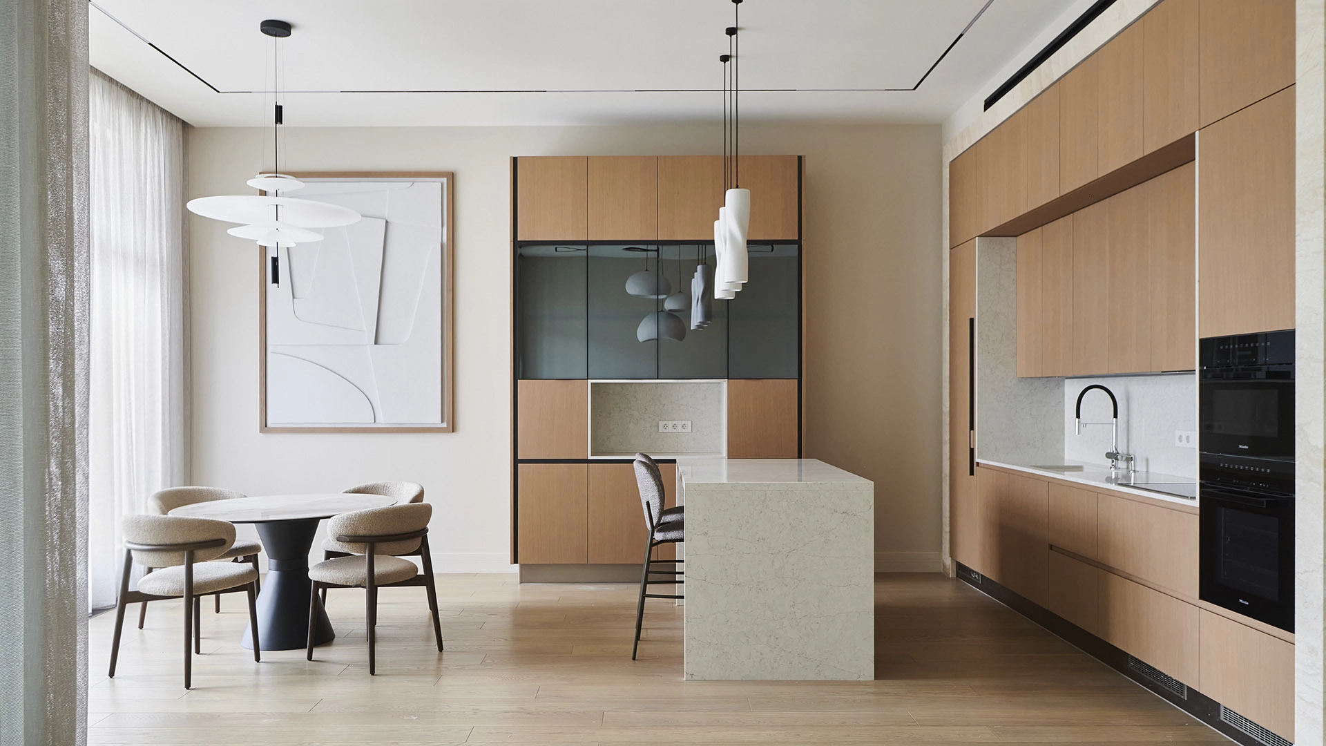 Функциональная планировка включает кухню-гостиную с обеденной зоной и выходом на лоджию, мастер-спальню с собственным санузлом, вторую спальню, гостевой санузел, гардеробную, постирочную и холл. Благодаря панорамному остеклению пространство наполнено естественным светом и теплом, открываются виды на парк и благоустроенную территорию комплекса.