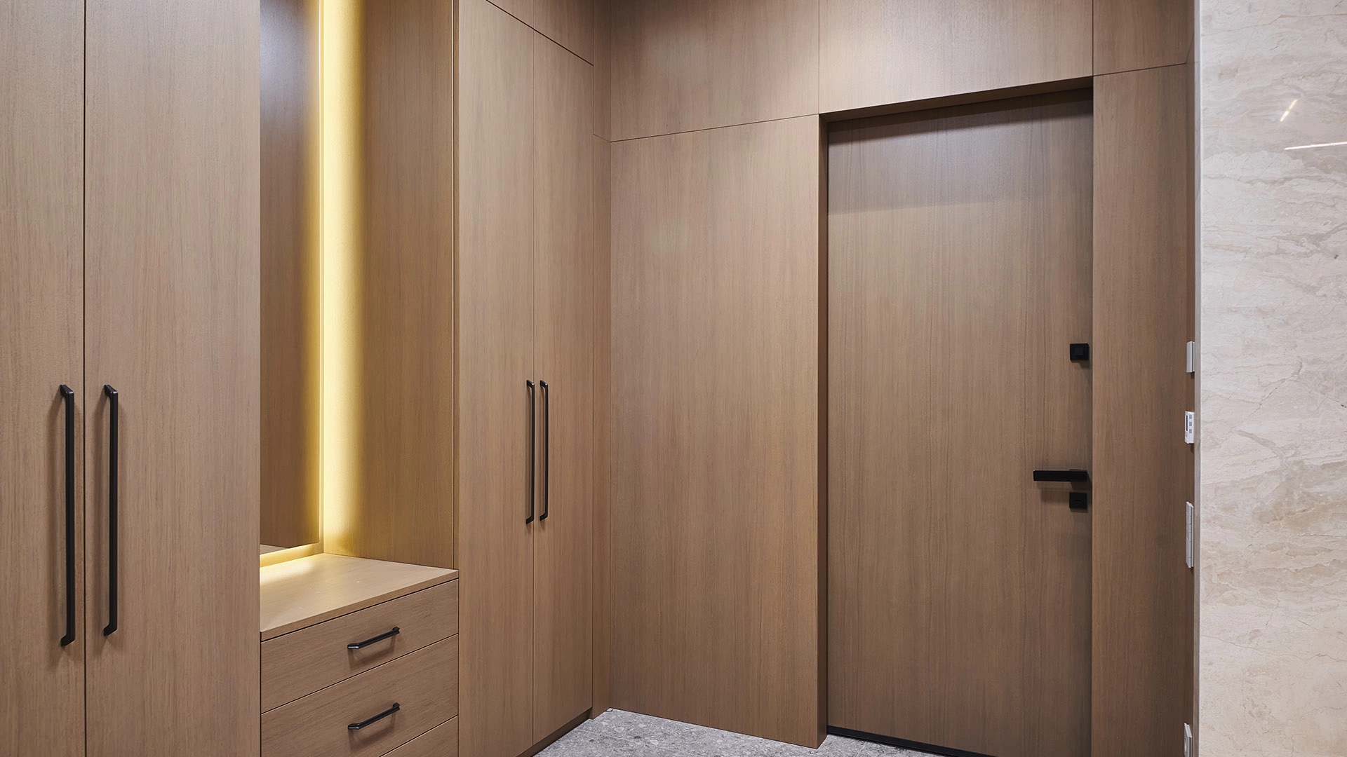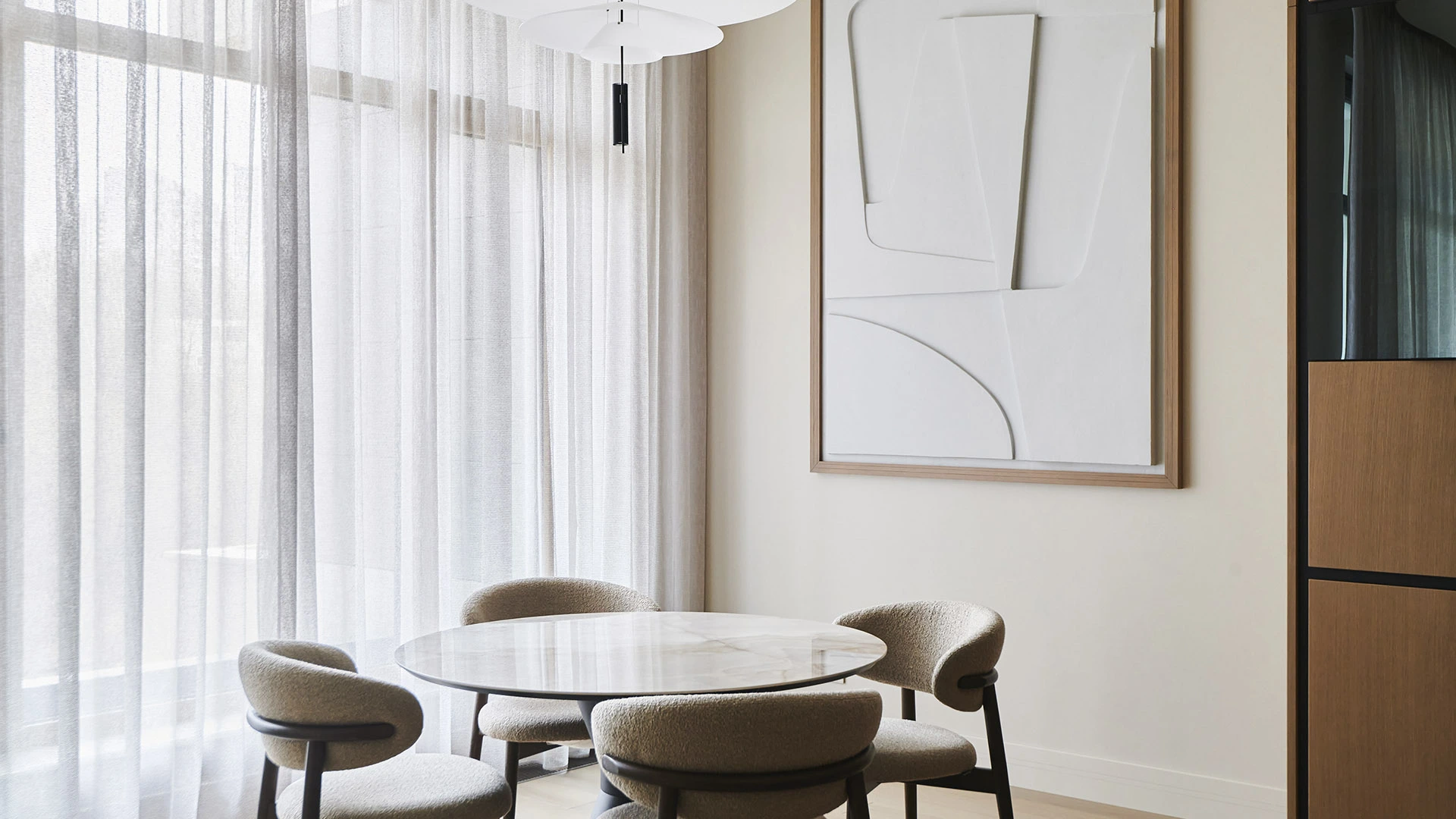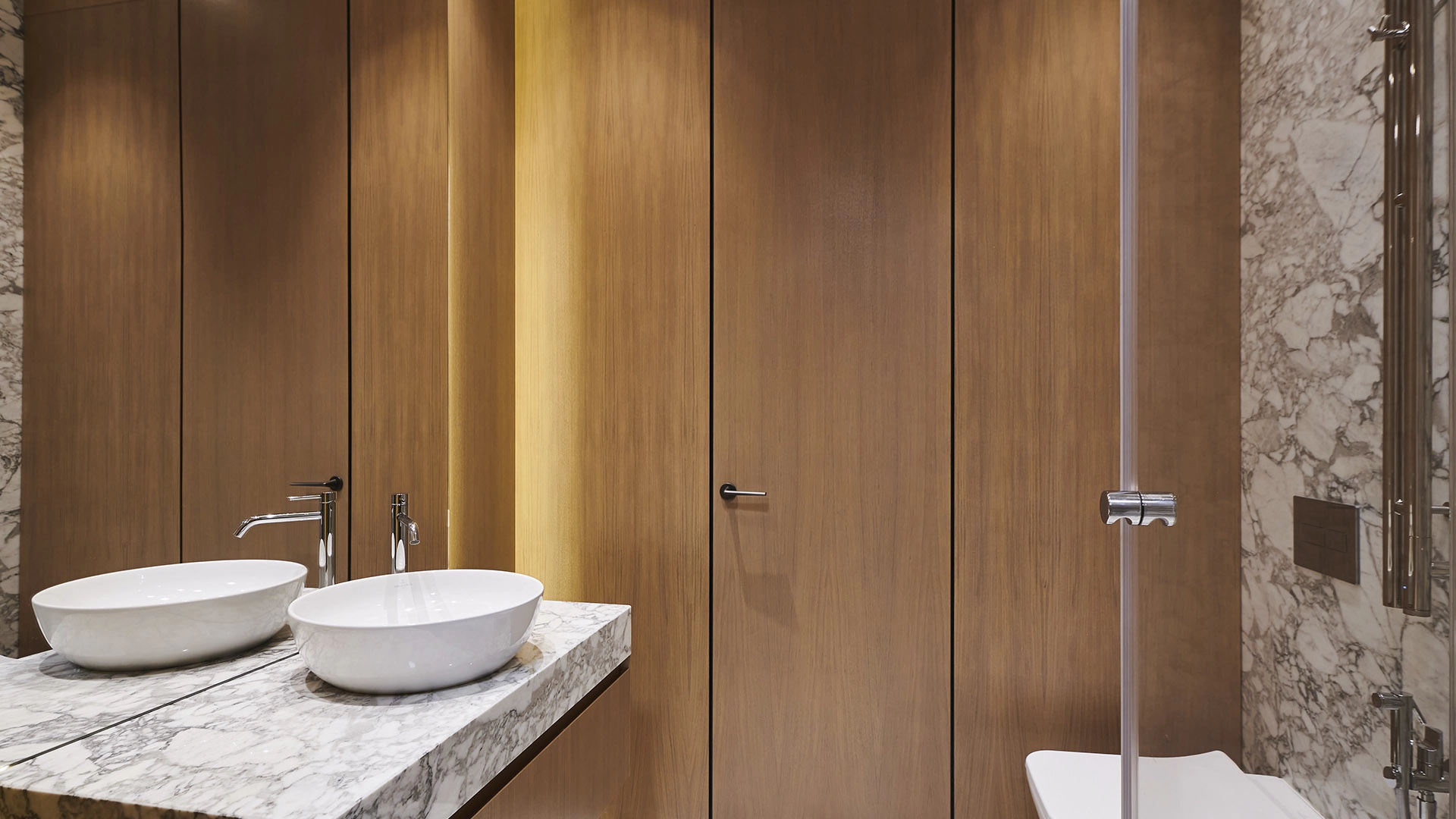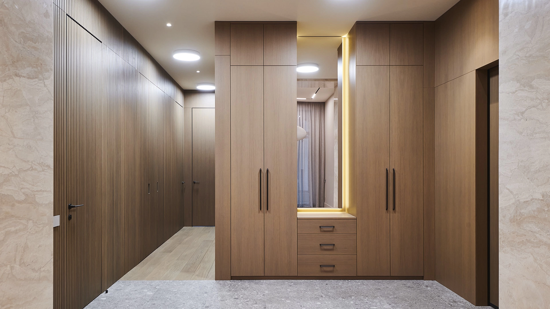 Функциональная планировка включает кухню-гостиную с обеденной зоной и выходом на лоджию, мастер-спальню с собственным санузлом, вторую спальню, гостевой санузел, гардеробную, постирочную и холл. Благодаря панорамному остеклению пространство наполнено естественным светом и теплом, открываются виды на парк и благоустроенную территорию комплекса.