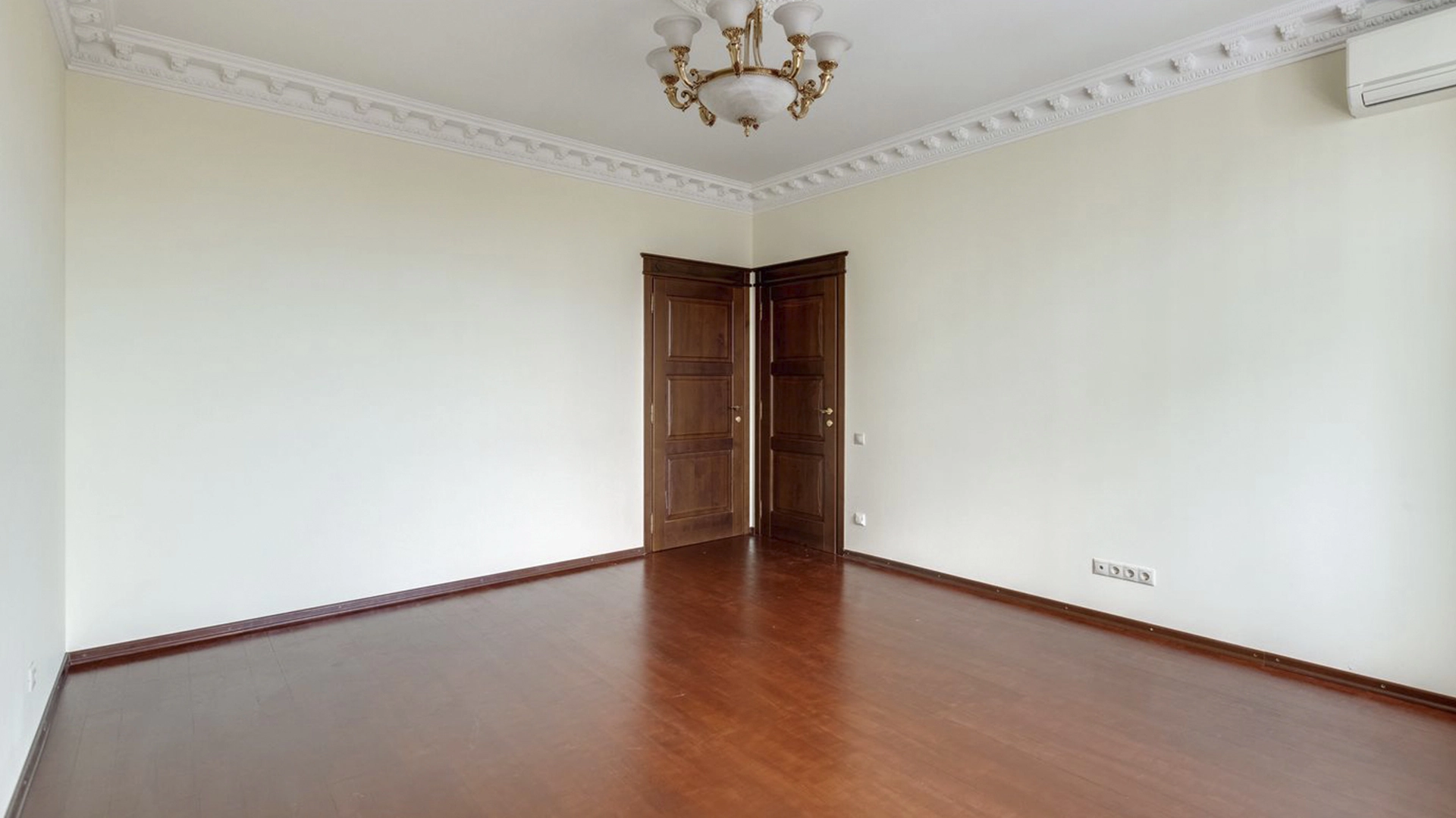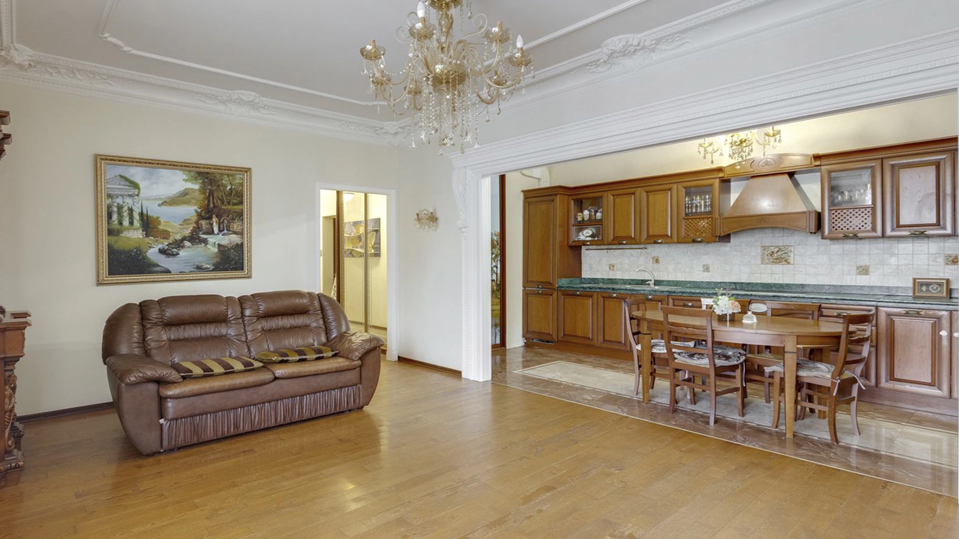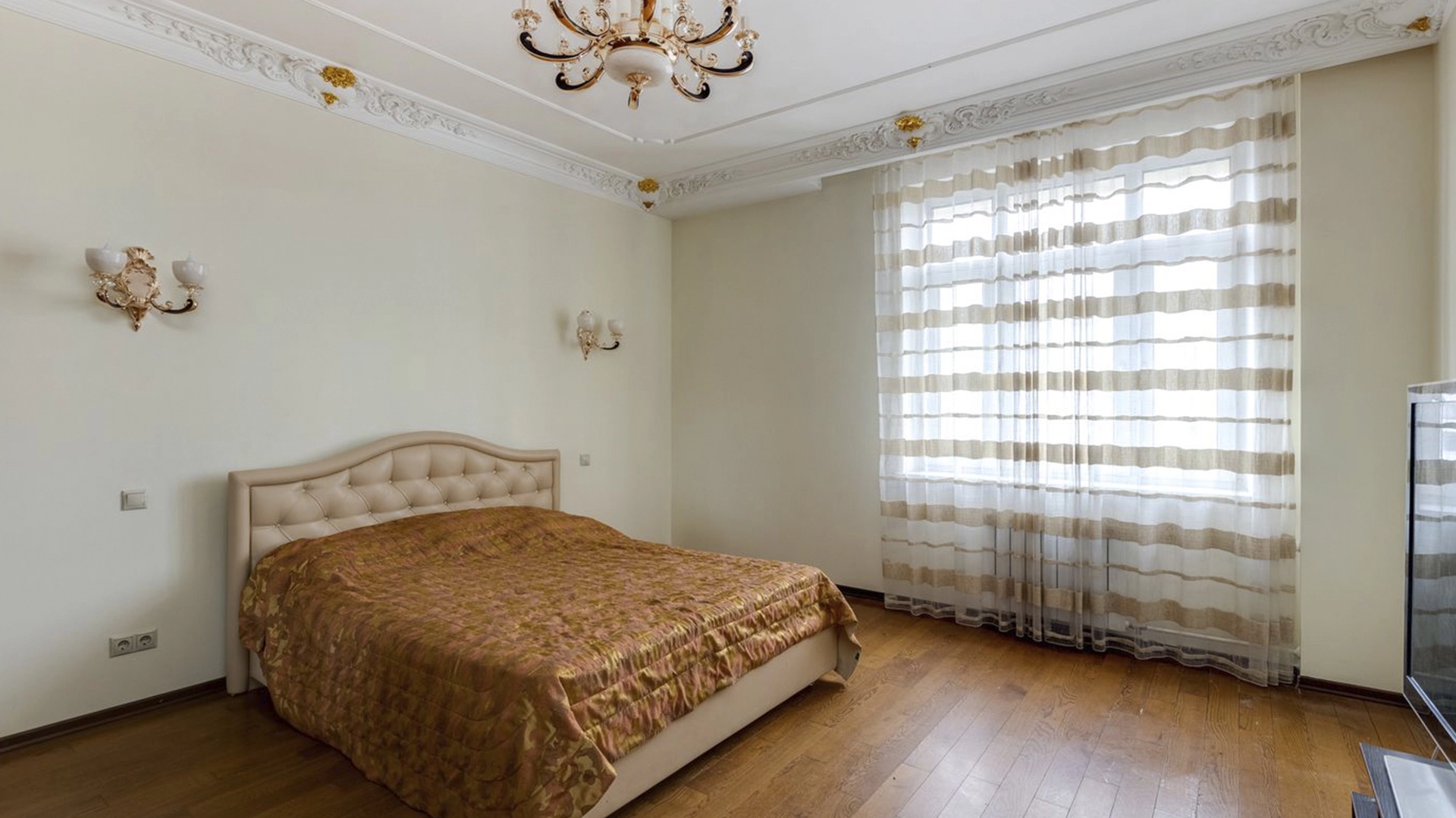 Просторная квартира с 3-мя спальнями в комплексе бизнес-класса «Вектор-Хаус». Квартира общей площадью 144 м² расположена на 9-м этаже. Выполнена авторская отделка в стиле современной классики, на полу уложены паркетная доска и плитка с текстурой мрамора. Стены и потолки украшены лепными деталями и карнизом.