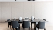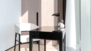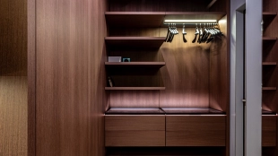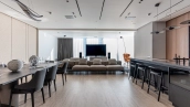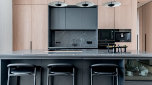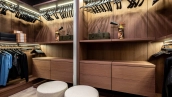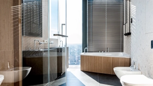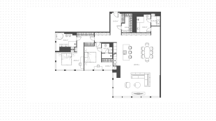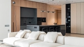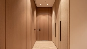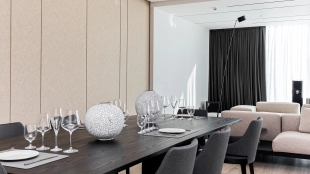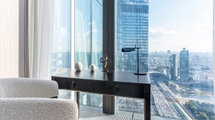 Функциональная планировка включает кухню-гостиную с обеденной зоной, мастер-спальню с собственной ванной комнатой и гардеробной, вторую спальню со своим санузлом и гардеробной, гостевой санузел, гардеробную и холл. Благодаря панорамному остеклению пространство наполнено естественным светом, открываются виды на город и башни «Москва-Сити».