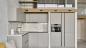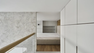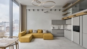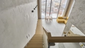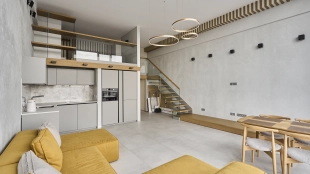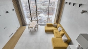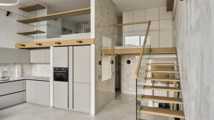 На первом уровне спланирована кухня-гостиная с обеденной и функциональной зоной хранения вещей, санузел и прихожая, на втором — спальня. Благодаря высоким потолкам 4,5 метра и панорамному остеклению пространство наполнено естественным светом и теплом. Из окон открываются виды на город, сталинские высотки и башни «Москва-Сити».