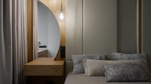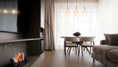 Квартира укомплектована мебелью и бытовой техникой. Установлена система центрального кондиционирования. Функциональная планировка включает кухню-гостиную с обеденной зоной и камином, мастер-спальню со своей ванной комнатой и гардеробной, вторую спальню, гостевой санузел и холл. Благодаря панорамному остеклению пространство наполнено естественным светом и теплом.