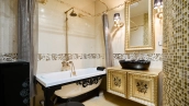 Продуманы различные сценарии освещения — люстры, настенные светильники и споты. Функциональная планировка включает просторную кухню-гостиную с обеденной зоной, мастер-спальню с собственной гардеробной и санузлом, две спальни, гостевой санузел, 2 гардеробные, постирочную и холл. Окна ориентированы на две стороны, открываются виды на город.