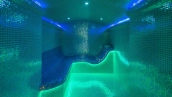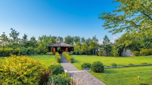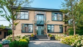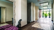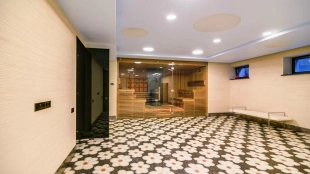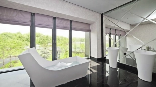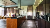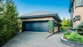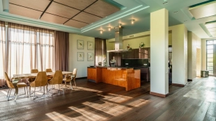 Необычный загородный дом с интерьером в стиле «эклектика» построен на большом ровном участке 30 соток. На территории разбиты цветники, посажены декоративные растения, вымощены дорожки, построена летняя беседка. Фасад дома и рядом стоящего гаража украшен мозаикой из цветного стекла. На первом этаже — столовая и кухня с островом. Из гостиной с дизайнерским камином из стекла и камня открывается панорамный вид на участок. Интерьер дома наполнен мягкой мебелью различных оттенков и стилей, деревом и натуральным камнем. На втором этаже расположены спальни и сауна с турецкой баней. Главная спальня отличается вертикальным угловым остеклением.